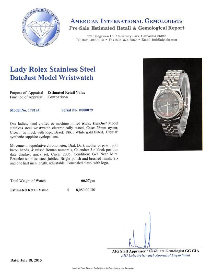 One ladies, hand crafted & machine milled Rolex DateJust Model stainless steel wristwatch electronically tested, Case: 26mm oyster, Crown: twinlock with logo, Bezel: 18KT White gold fluted, Crystal: synthetic sapphire cyclops lens. Movement: superlative chronometer, Dial: Dark mother of pearl, with baton hands, & raised Roman numerals, Calendar: 3 o'clock position date display, quick set, Circa: 2005, Condition: G-7 Near Mint. Bracelet: stainless steel jubilee. Bright polish and brushed finish. Six and one half inch length, adjustable. Concealed clasp, with logo. Total Weight of Watch 66.37gm. AIG Appraised at $8,050.00.
