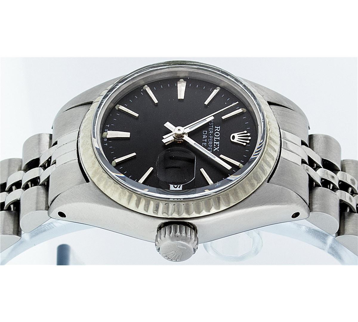 One Ladies Rolex Datejust Polished Bright with Satin Finish, Serviced & Electronically Tested, Stainless Steel Case:26mm, Stainless Steel Crown, Bezel: 14K Fluted Bezel. Custom Crystal: Acrylic Cyclops Lens. Movement: Automatic Winding Movement Caliber 2030. Dial: Black Index Dial. Date Window: 3 O'Clock Position Date Display, Model: Datejust. Condition: G-6 Extra Fine. Bracelet: Stainless Steel Jubilee Band. Bright Polish & Satin Finish. 6.0 Inch Length, Adjustable. Standard Clasp, With Rolex Logo. Comes with 6 month warranty.