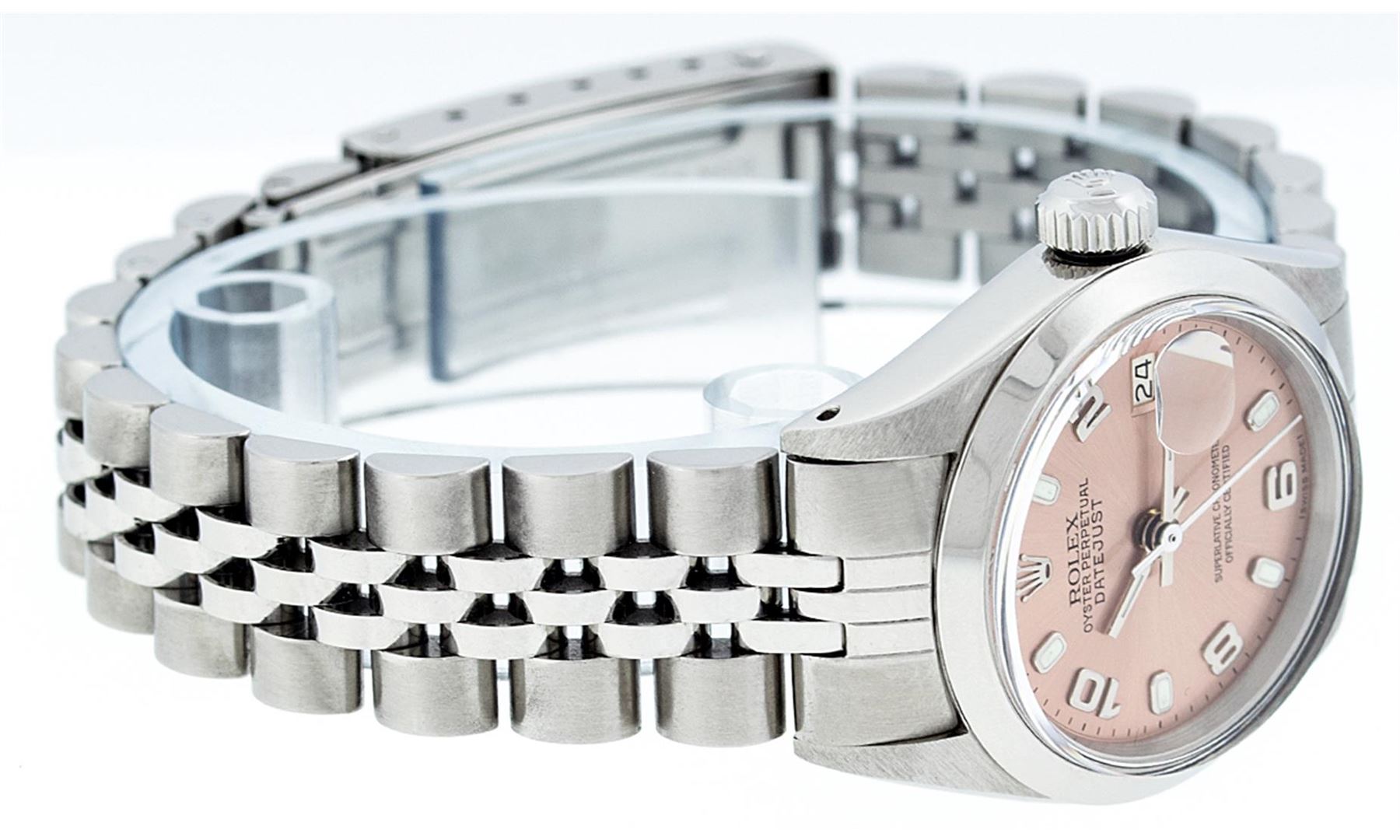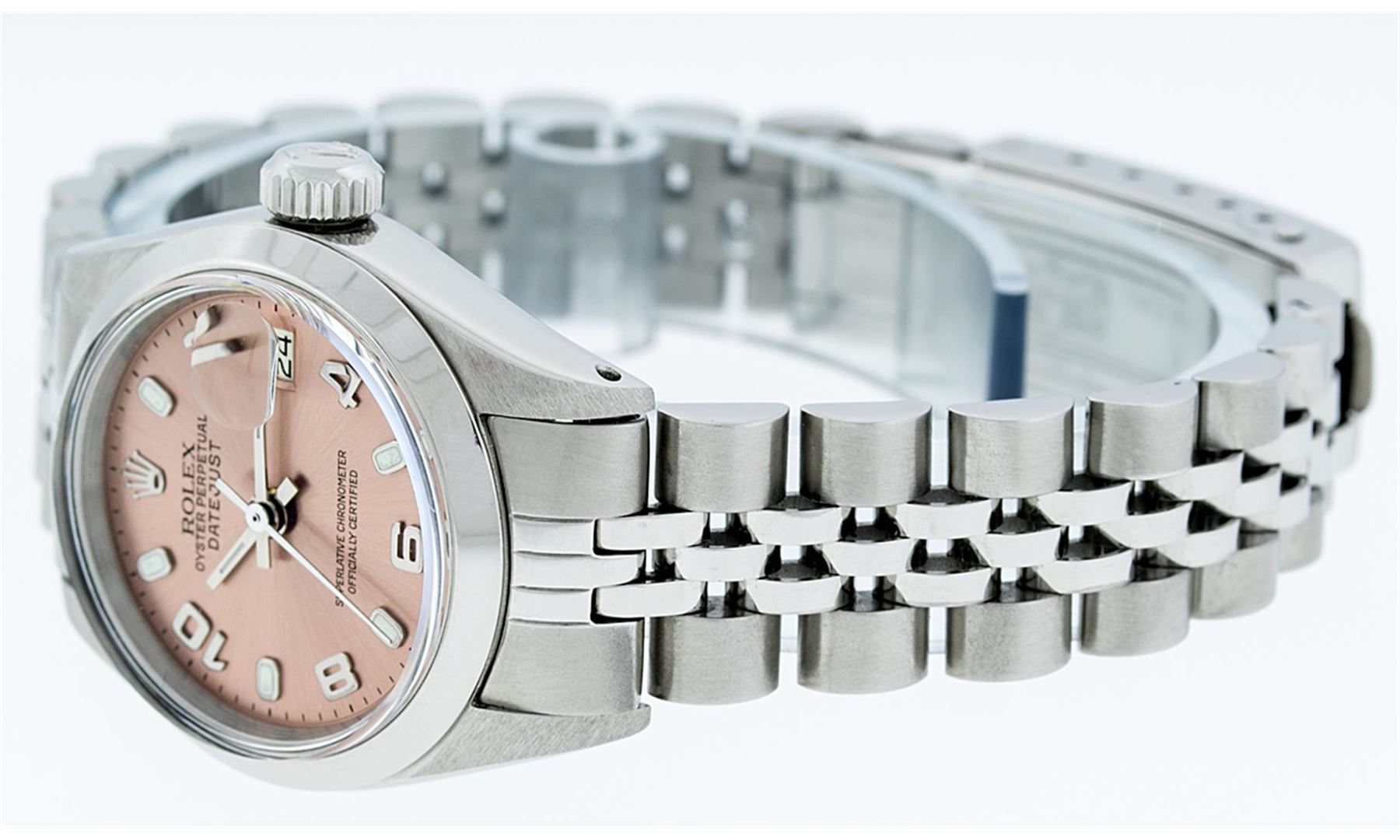 One Ladies Rolex Datejust Polished Bright with Satin Finish, Serviced & Electronically Tested, Stainless Steel Case:26mm, Stainless Steel Crown, Bezel: Stainless Steel Smooth. Custom Crystal: Acrylic Cyclops Lens. Movement: Automatic Winding Movement Caliber 2030. Dial: Salmon Arabic Dial. Date Window: 3 O'clock Position Date Display, Model: Datejust. Condition: G-6 Extra Fine. Bracelet: Stainless Steel Jubilee Band. Bright Polish & Satin Finish. 6.0 Inch Length, Adjustable. Standard Clasp, With Rolex Logo. Comes with 6 month warranty.