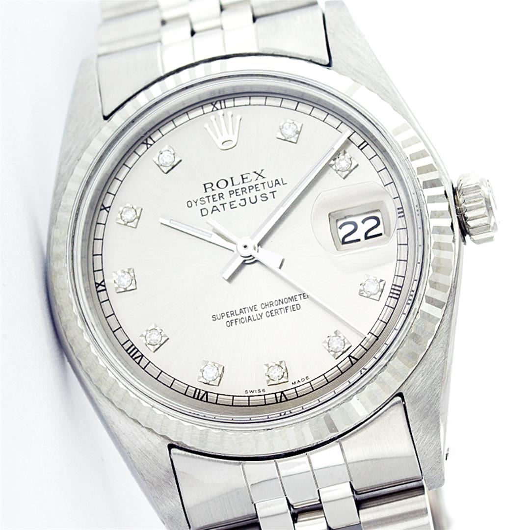 One Gents Rolex Datejust Polished Bright with Satin Finish, Serviced & Electronically Tested, Stainless Steel Case:36mm, Stainless Steel Crown, Original Bezel: 14K White Gold Fluted Bezel. Custom Crystal: Synthetic Sapphire Cyclops Lens. Movement: Automatic Winding Movement Caliber 3035. Custom Dial: Silver Dial With Diamond Hour Markers, 10 Diamond in Dial G To H In Color, Si-VS Clarity. Date Window: 3 O'Clock Position Date Display, Quickset, Model: 16014 Condition: G-6 Extra Fine. Bracelet: Stainless Steel Jubilee. Bright Polish & Satin Finish. 6.5 Inch Length, Adjustable. Standard Clasp, With Rolex Logo.