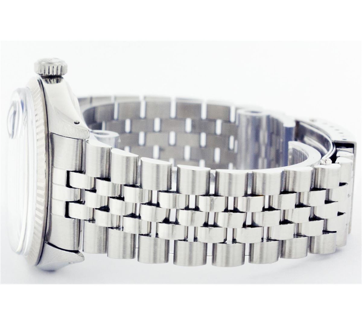 One Mens Rolex Datejust Polished Bright with Satin Finish, Serviced & Electronically Tested, Stainless Steel Case:36mm, Stainless Steel Crown, Original Bezel: 14K White Gold Fluted Bezel. Custom Crystal: Acrylic Cyclops Lens. Movement: Automatic Winding Movement Caliber 3035. Custom Dial: Blue Dial With Diamond Hour Markers and Track + Baguette Diamonds On The 6 & 9 Hour Marker, Diamond Count: 8 Diamonds + 2 Baguettes in Dial G To H In Color, Si-VS Clarity. Date Window: 3 O'Clock Position Date Display, Quickset, Model: 16014 Condition: G-6 Extra Fine. Bracelet:Stainless Steel Jubilee. Bright Polish & Satin Finish. 6.5 Inch Length, Adjustable. Standard Clasp, With Rolex Logo.