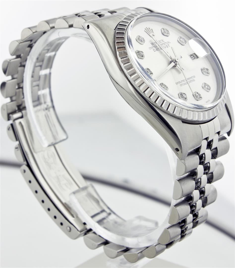 One Gents Rolex Datejust Polished Bright with Satin Finish, Serviced & Electronically Tested, Stainless Steel Case:36mm, Stainless Steel Crown, Original Bezel: 14K White Gold Fluted Bezel. Custom Crystal: Acrylic Cyclops Lens. Movement: Automatic Winding Movement Caliber 3035. Custom Dial: Silver Dial With Diamond Hour Markers, 10 Diamond in Dial G To H In Color, Si-VS Clarity. Date Window: 3 O'Clock Position Date Display, Quickset, Model: 16014 Condition: G-6 Extra Fine. Bracelet: Stainless Steel Jubilee. Bright Polish & Satin Finish. 6.5 Inch Length, Adjustable. Standard Clasp, With Rolex Logo.