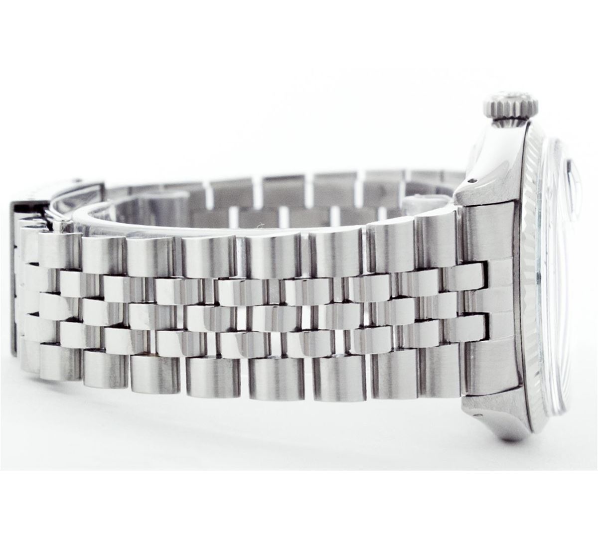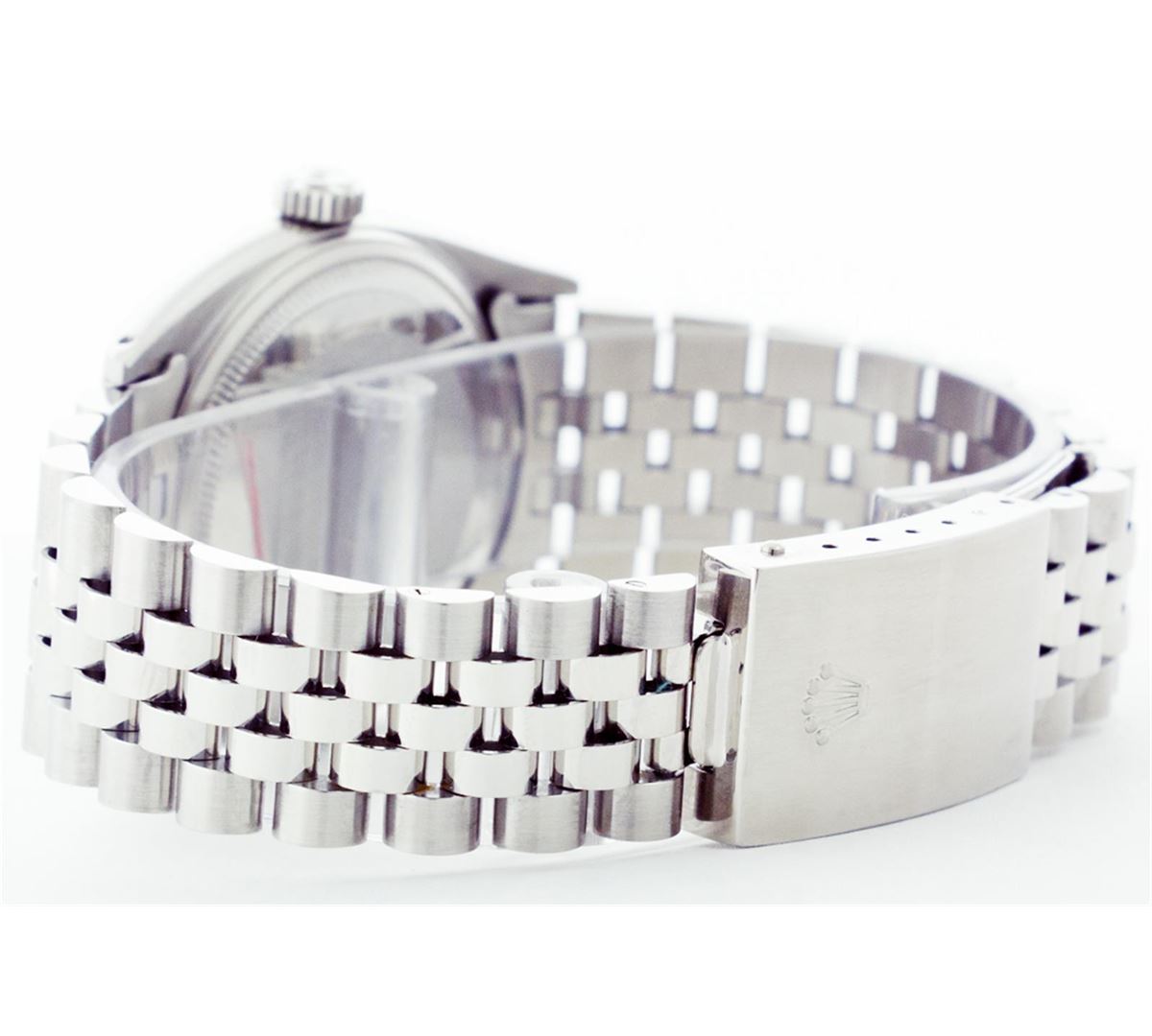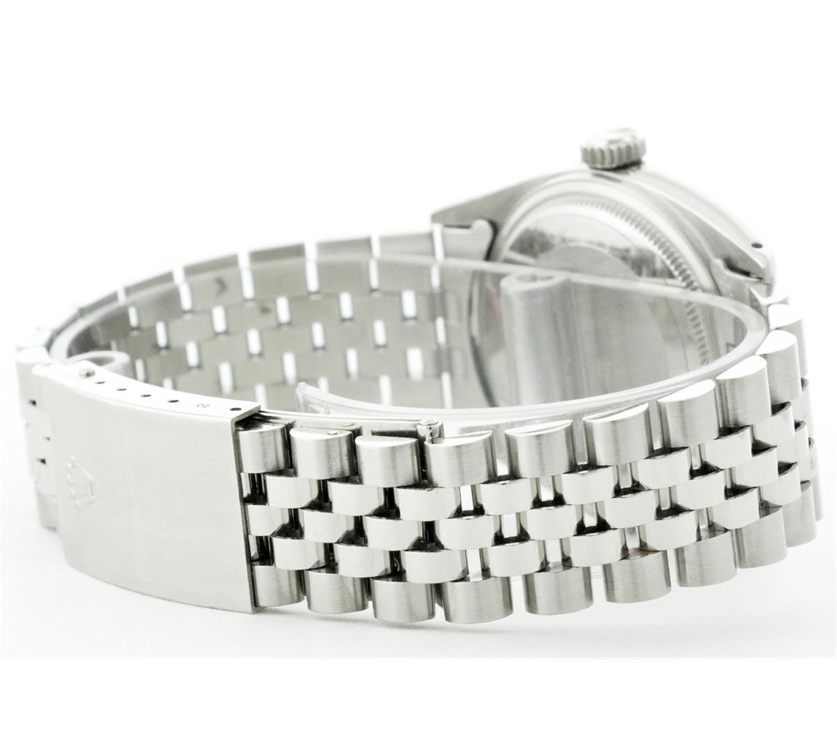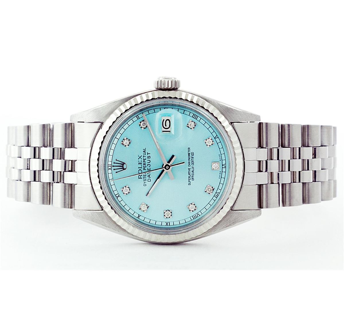 One Mens Rolex Datejust Polished Bright with Satin Finish, Serviced & Electronically Tested, Stainless Steel Case:36mm, Stainless Steel Crown, Original Bezel: 14K White Gold Fluted Bezel. Custom Crystal: Acrylic Cyclops Lens. Movement: Automatic Winding Movement Caliber 3035. Custom Dial: Ice Blue Dial With Diamond Hour Markers and Track, 10 Diamond in Dial G To H In Color, Si-VS Clarity. Date Window: 3 O'Clock Position Date Display, Quickset, Model: 16014 Condition: G-6 Extra Fine. Bracelet:Stainless Steel Jubilee. Bright Polish & Satin Finish. 6.5 Inch Length, Adjustable. Standard Clasp, With Rolex Logo.