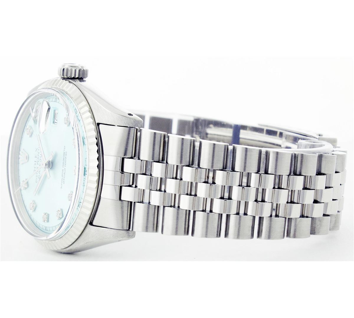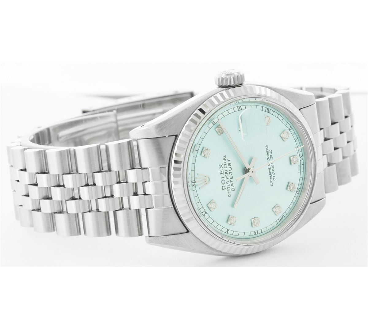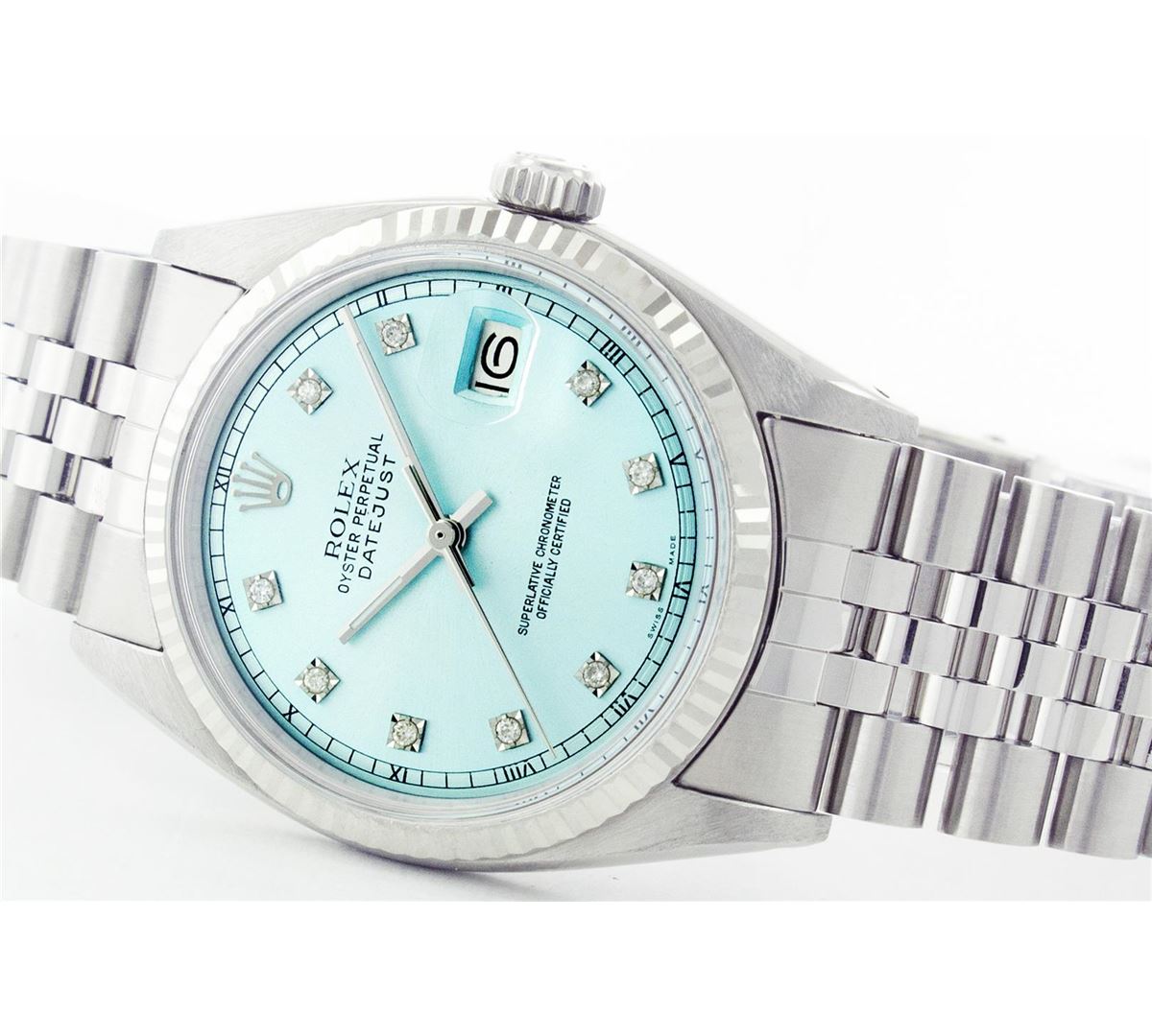One Gents Rolex Datejust Polished Bright with Satin Finish, Serviced & Electronically Tested, Stainless Steel Case:36mm, Stainless Steel Crown, Original Bezel: 14K White Gold Fluted Bezel. Custom Crystal: Acrylic Cyclops Lens. Movement: Automatic Winding Movement Caliber 3035. Custom Dial: Ice Blue Dial With Diamond Hour Markers, 10 Diamond in Dial G To H In Color, Si-VS Clarity. Date Window: 3 O'Clock Position Date Display, Quickset, Model: 16014 Condition: G-6 Extra Fine. Bracelet: Stainless Steel Jubilee. Bright Polish & Satin Finish. 6.5 Inch Length, Adjustable. Standard Clasp, With Rolex Logo.