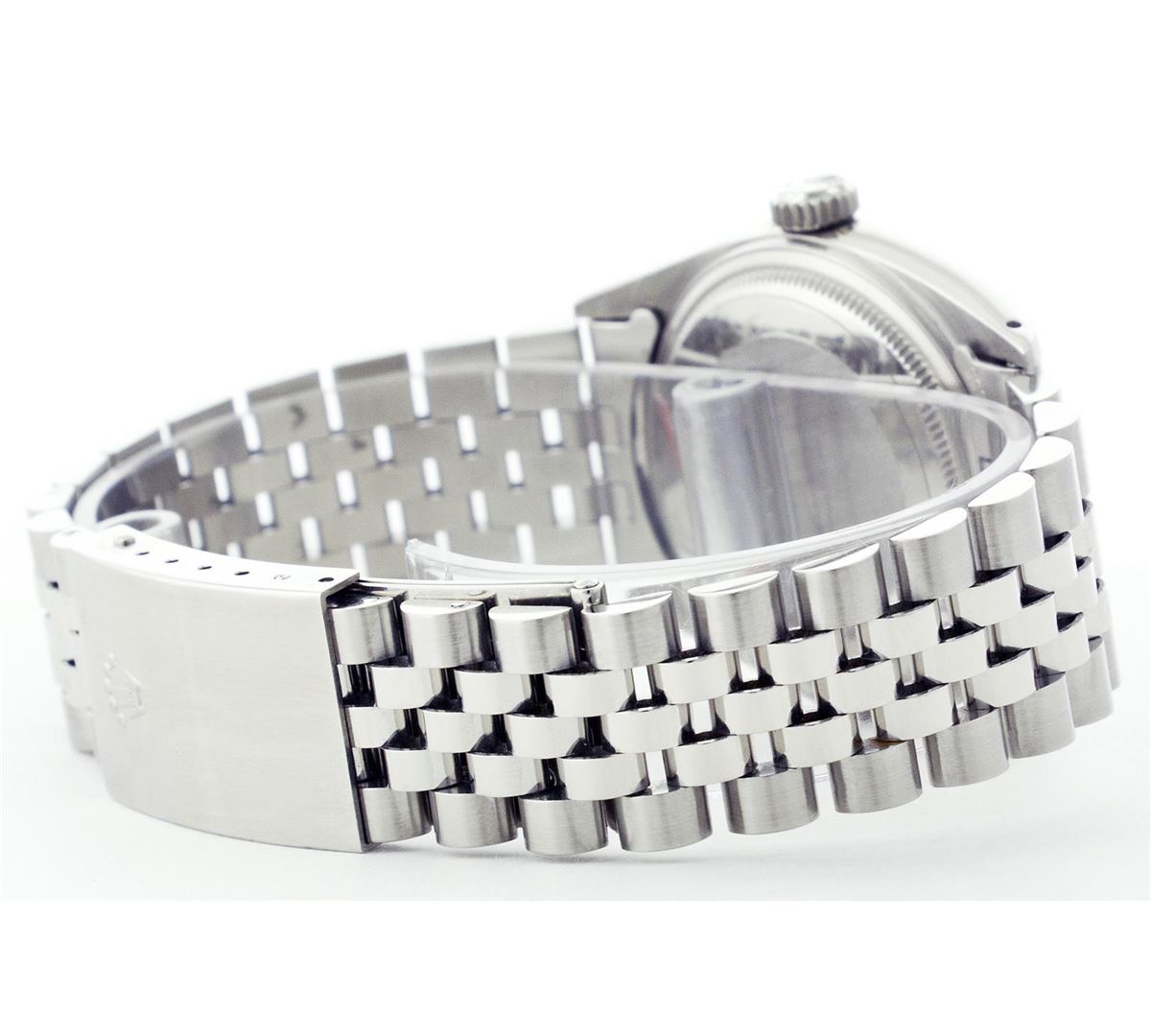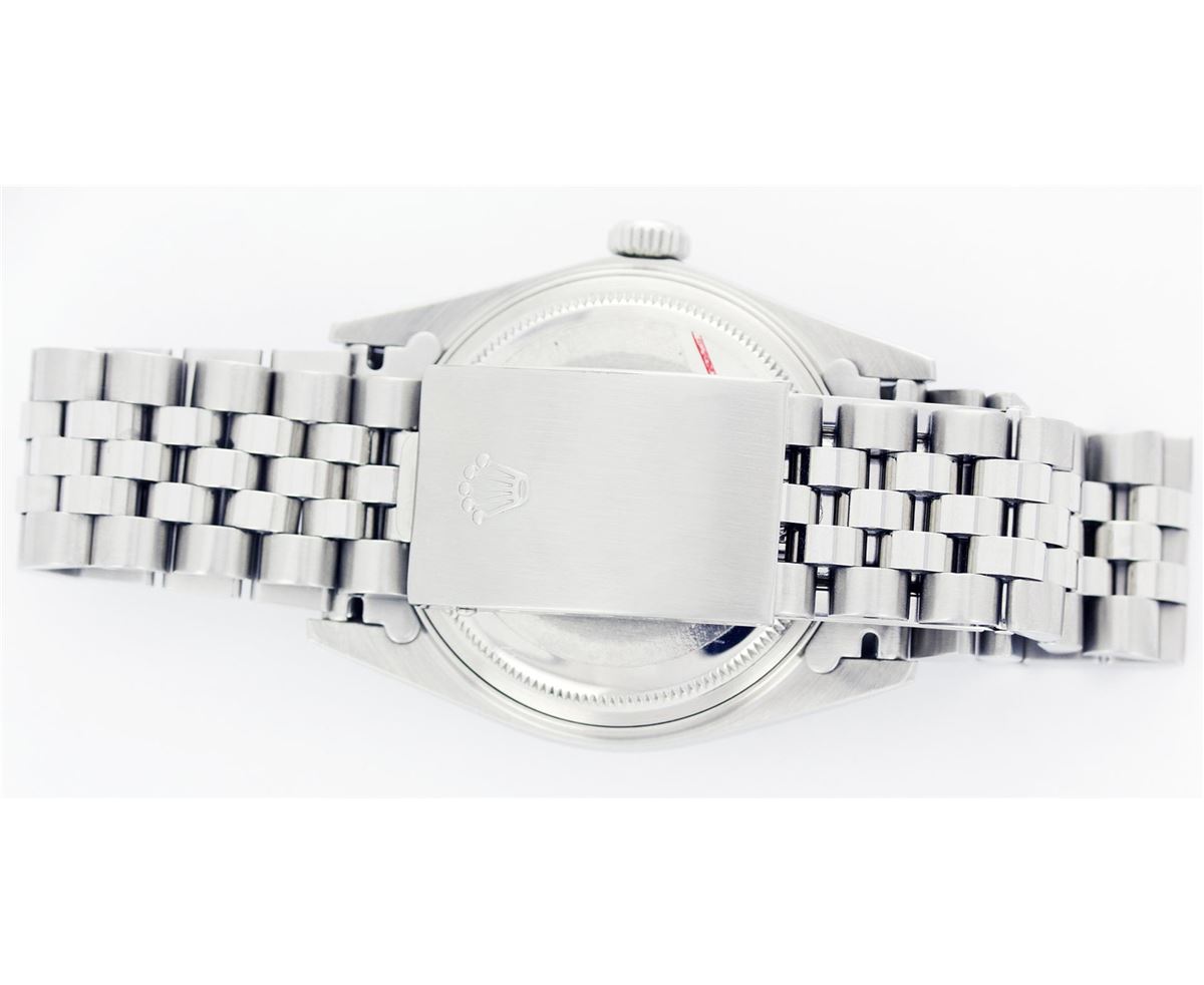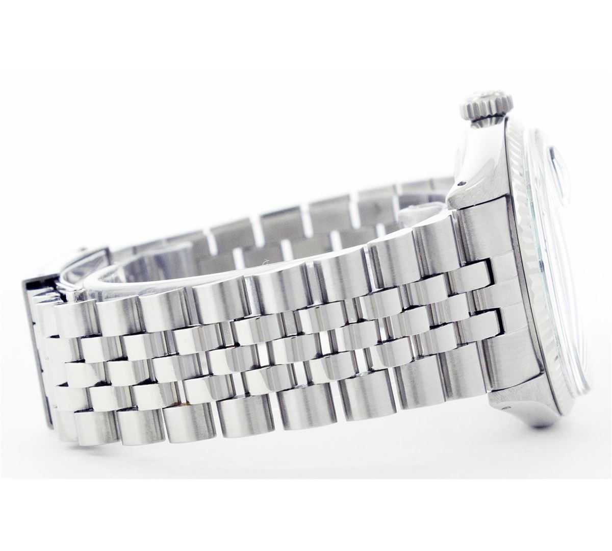 One Gents Rolex Datejust Polished Bright with Satin Finish, Serviced & Electronically Tested, Stainless Steel Case:36mm, Stainless Steel Crown, Original Bezel: 14K White Gold Fluted Bezel. Custom Crystal: Acrylic Cyclops Lens. Movement: Automatic Winding Movement Caliber 3035. Custom Dial: Ice Blue Dial With Diamond Hour Markers, 10 Diamond in Dial G To H In Color, Si-VS Clarity. Date Window: 3 O'Clock Position Date Display, Quickset, Model: 16014 Condition: G-6 Extra Fine. Bracelet: Stainless Steel Jubilee. Bright Polish & Satin Finish. 6.5 Inch Length, Adjustable. Standard Clasp, With Rolex Logo.