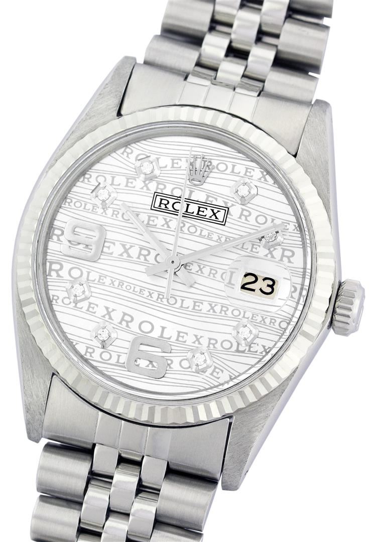 One Gents Rolex Datejust Polished, Serviced & Electronically Tested, Stainless Steel Case:36mm, Stainless Steel Crown, Bezel: 18K White Gold Fluted Bezel. Custom Crystal: Acrylic Cyclops Lens. Movement: Automatic Winding Movement Caliber 3035. Custom Dial: Silver Wave Dial With Diamond Hour Markers, Diamond Count: 10 Diamonds, Clarity: SI-VS, Color: G To H. Date Window: 3 O'Clock Position Date Display, Quickset, Model: 16014 Condition: G-6 Extra Fine. Bracelet: Stainless Steel Jubilee. Bright Polish & Satin Finish. 6.5 Inch Length, Adjustable. Standard Clasp, With Rolex Logo.