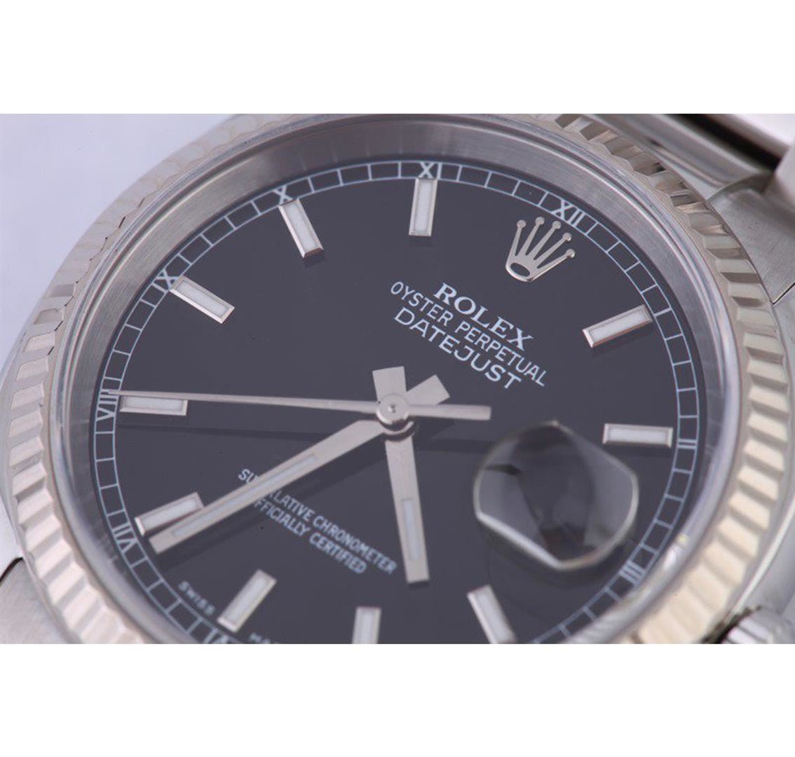 One gents stainless steel Rolex DateJust wristwatch. Model Name/Number: DateJust 116234. The watch features automatic movement with date, scratch-resistant sapphire crystal, waterproof screw-down crown. Case: Stainless steel with 18k white gold fluted bezel (36mm). Dial: Black Index with white chapter ring. Bracelet: Stainless steel Oyster.