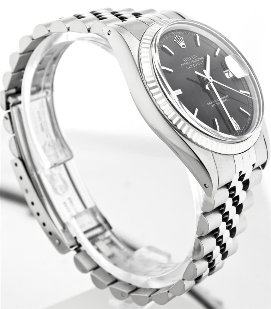 One Gents Rolex Datejust Polished, Serviced & Electronically Tested, Stainless Steel Case:36mm, Stainless Steel Crown, Bezel: 18K White Gold Fluted Bezel. Custom Crystal: Acrylic Cyclops Lens. Movement: Automatic Winding Movement Caliber 3035. Custom Dial: Black Dial With Index Hour Markers. Date Window: 3 O'Clock Position Date Display, Quickset, Model: 16014 Condition: G-6 Extra Fine. Bracelet: Stainless Steel Jubilee. Bright Polish & Satin Finish. 6.5 Inch Length, Adjustable. Standard Clasp, With Rolex Logo.
