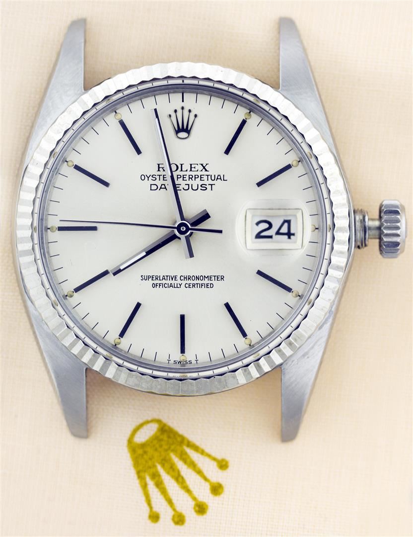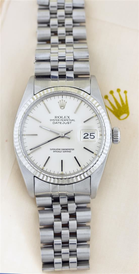 One Gents Rolex Datejust Polished, Serviced & Electronically Tested, Stainless Steel Case:36mm, Stainless Steel Crown, Custom Bezel: 18K White Gold Fluted Bezel. Custom Crystal: Acrylic Cyclops Lens. Movement: Automatic Winding Movement Caliber 3035. Custom Dial: Silver Index Dial. Date Window: 3 O'Clock Position Date Display, Quickset, Model: 16014 Condition: G-6 Extra Fine. Bracelet: Stainless Steel Jubilee. Bright Polish & Satin Finish. 6.5 Inch Length, Adjustable. Standard Clasp, With Rolex Logo.