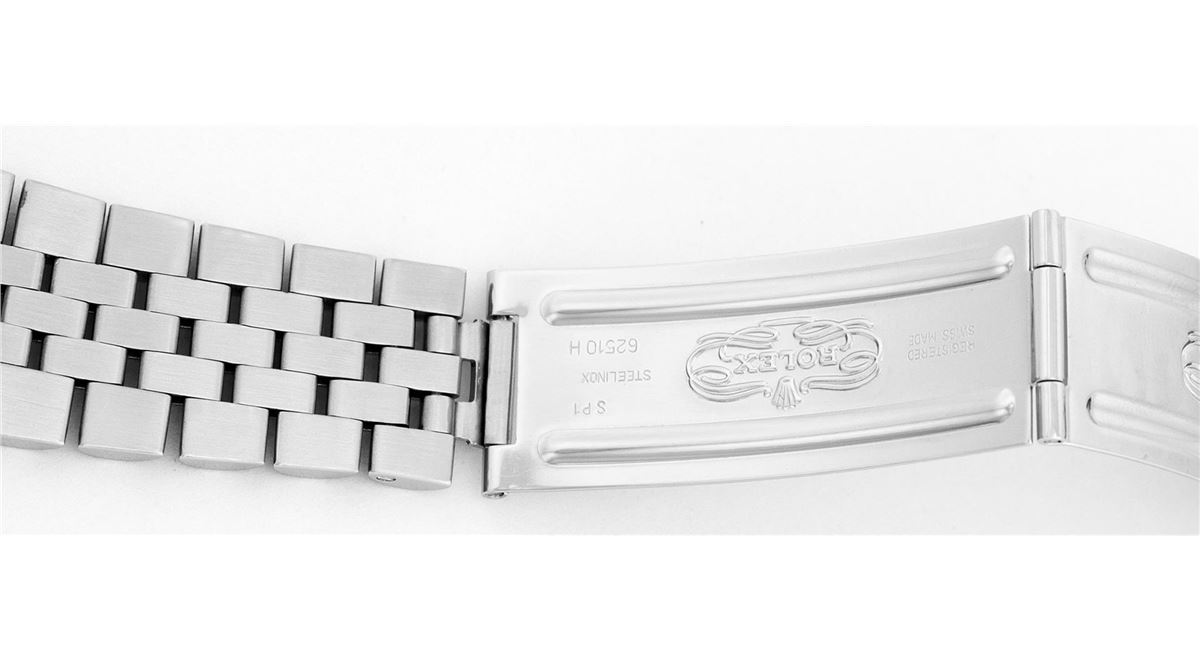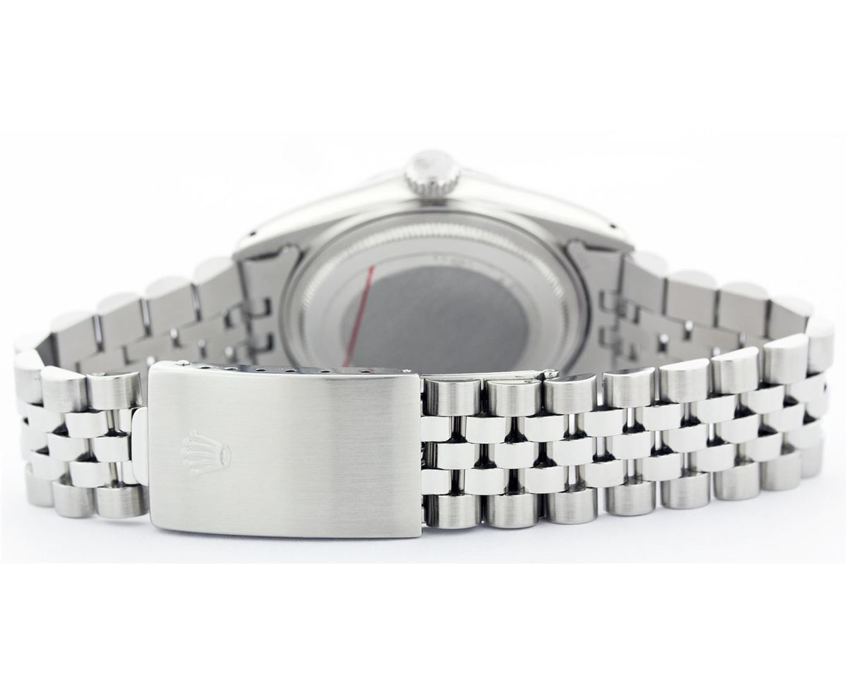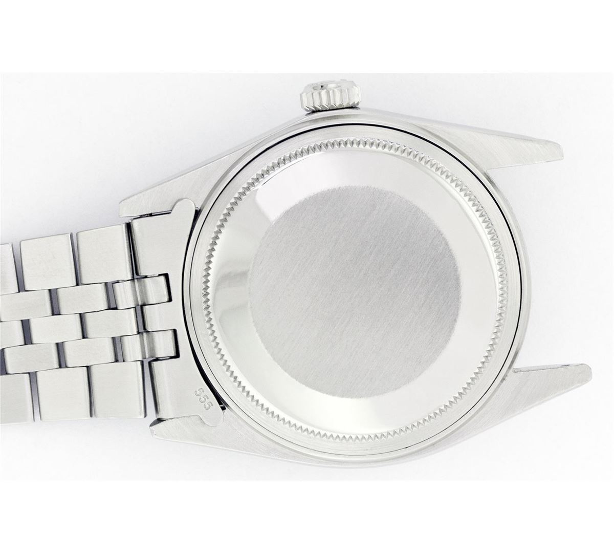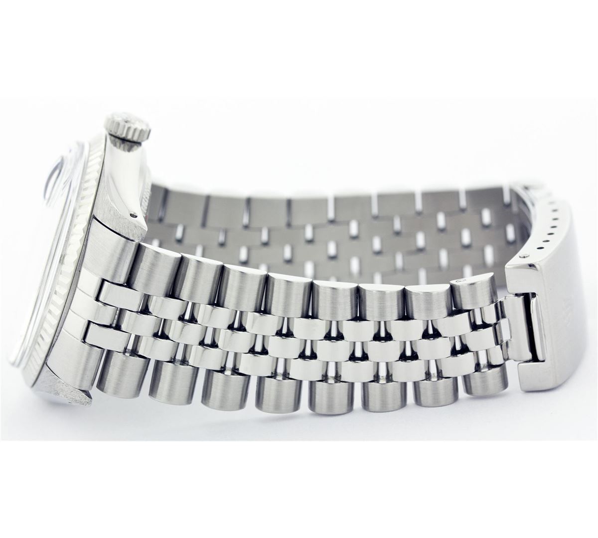 One Gents Rolex Datejust Polished, Serviced & Electronically Tested, Stainless Steel Case:36mm, Stainless Steel Crown, Bezel: 18K White Gold Fluted Bezel. Custom Crystal: Acrylic Cyclops Lens. Movement: Automatic Winding Movement Caliber 3035. Custom Dial: Silver Wave Dial With Diamond Hour Markers, Diamond Count: 10 Diamonds, Clarity: SI-VS, Color: G To H. Date Window: 3 O'Clock Position Date Display, Quickset, Model: 16014 Condition: G-6 Extra Fine. Bracelet: Stainless Steel Jubilee. Bright Polish & Satin Finish. 6.5 Inch Length, Adjustable. Standard Clasp, With Rolex Logo.