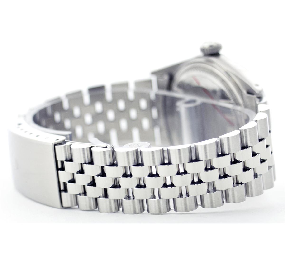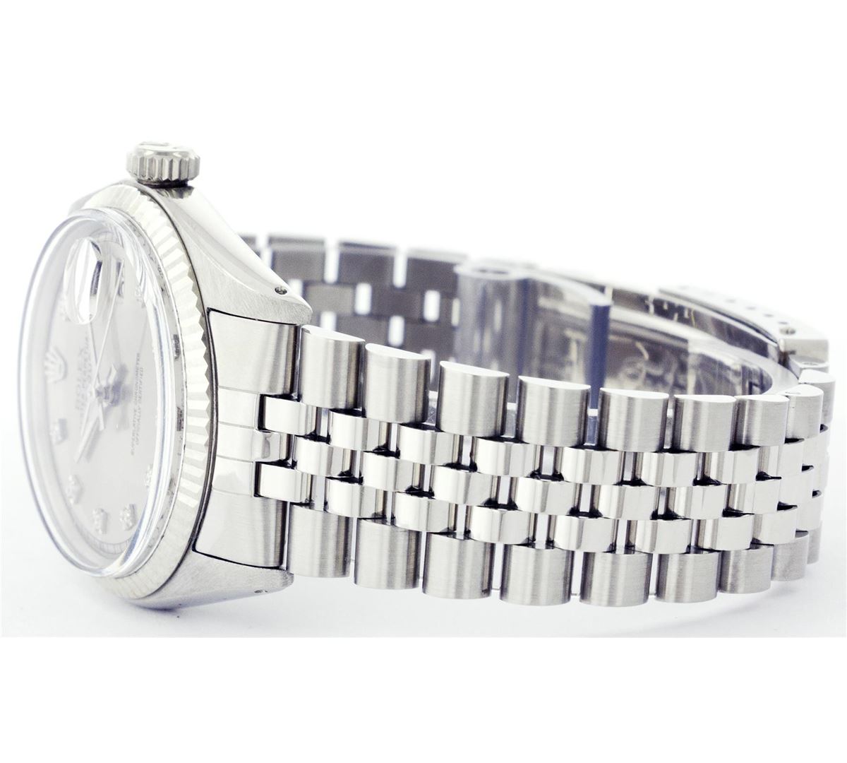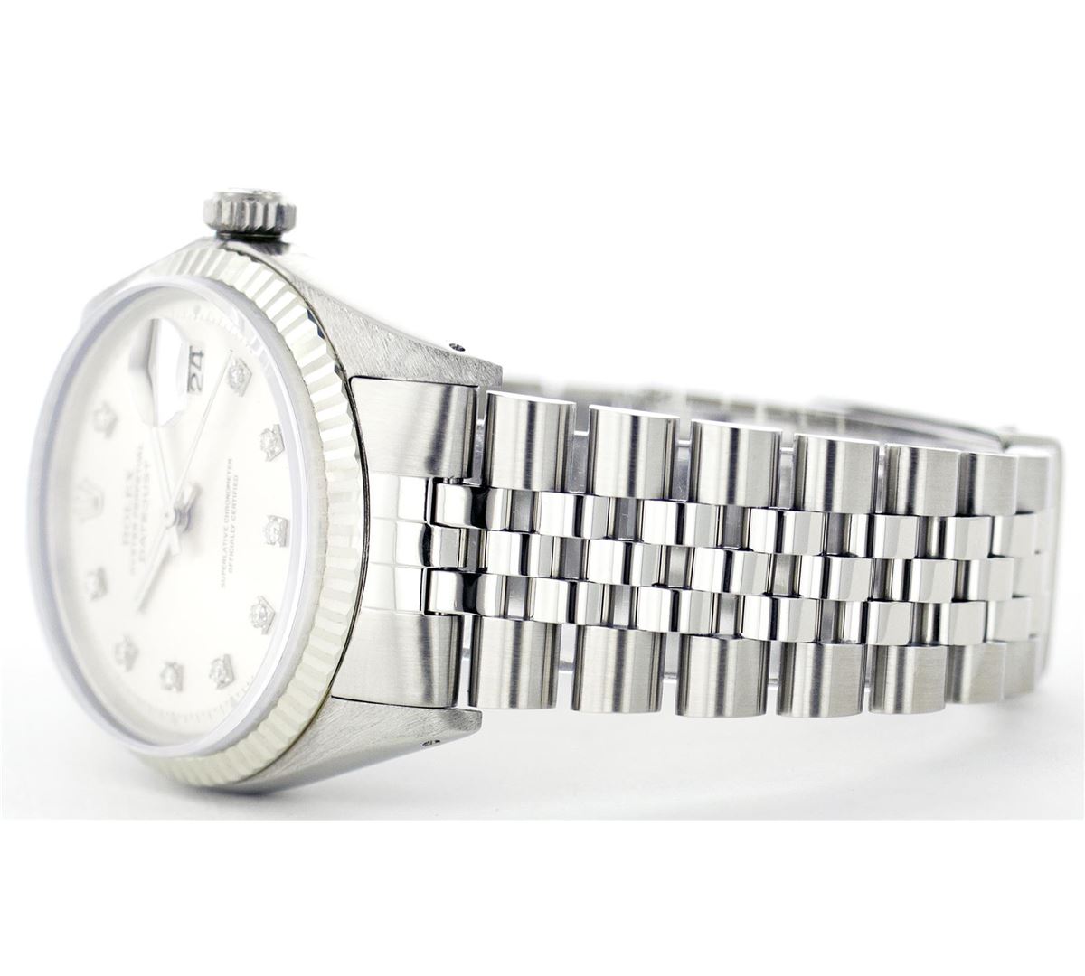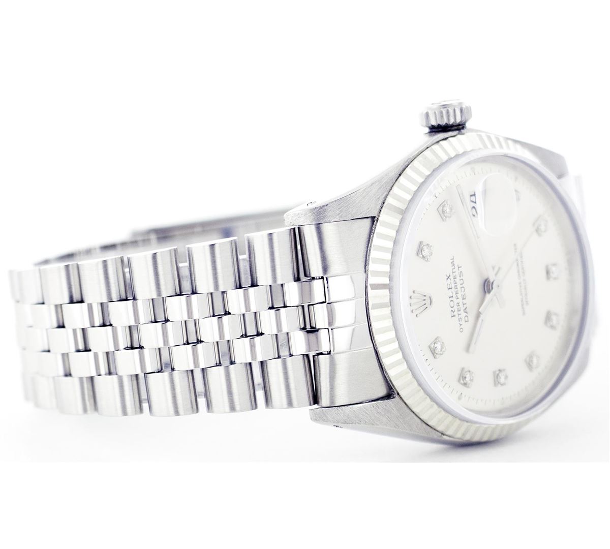 One Mens Rolex Datejust Polished Bright with Satin Finish, Serviced & Electronically Tested, Stainless Steel Case:36mm, Stainless Steel Crown, Original Bezel: 14K White Gold Fluted Bezel. Custom Crystal: Synthetic Sapphire Cyclops Lens. Movement: Automatic Winding Movement Caliber 3035. Custom Dial: Silver Dial With Diamond Hour Markers, 10 Diamond in Dial G To H In Color, Si-VS Clarity. Date Window: 3 O'Clock Position Date Display, Quickset, Model: 16014 Condition: G-6 Extra Fine. Bracelet: Stainless Steel Jubilee. Bright Polish & Satin Finish. 6.5 Inch Length, Adjustable. Standard Clasp, With Rolex Logo.