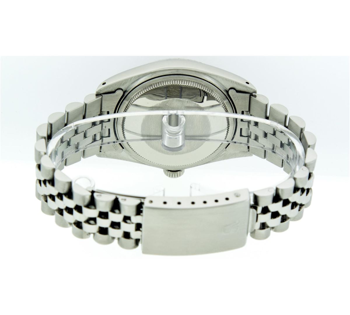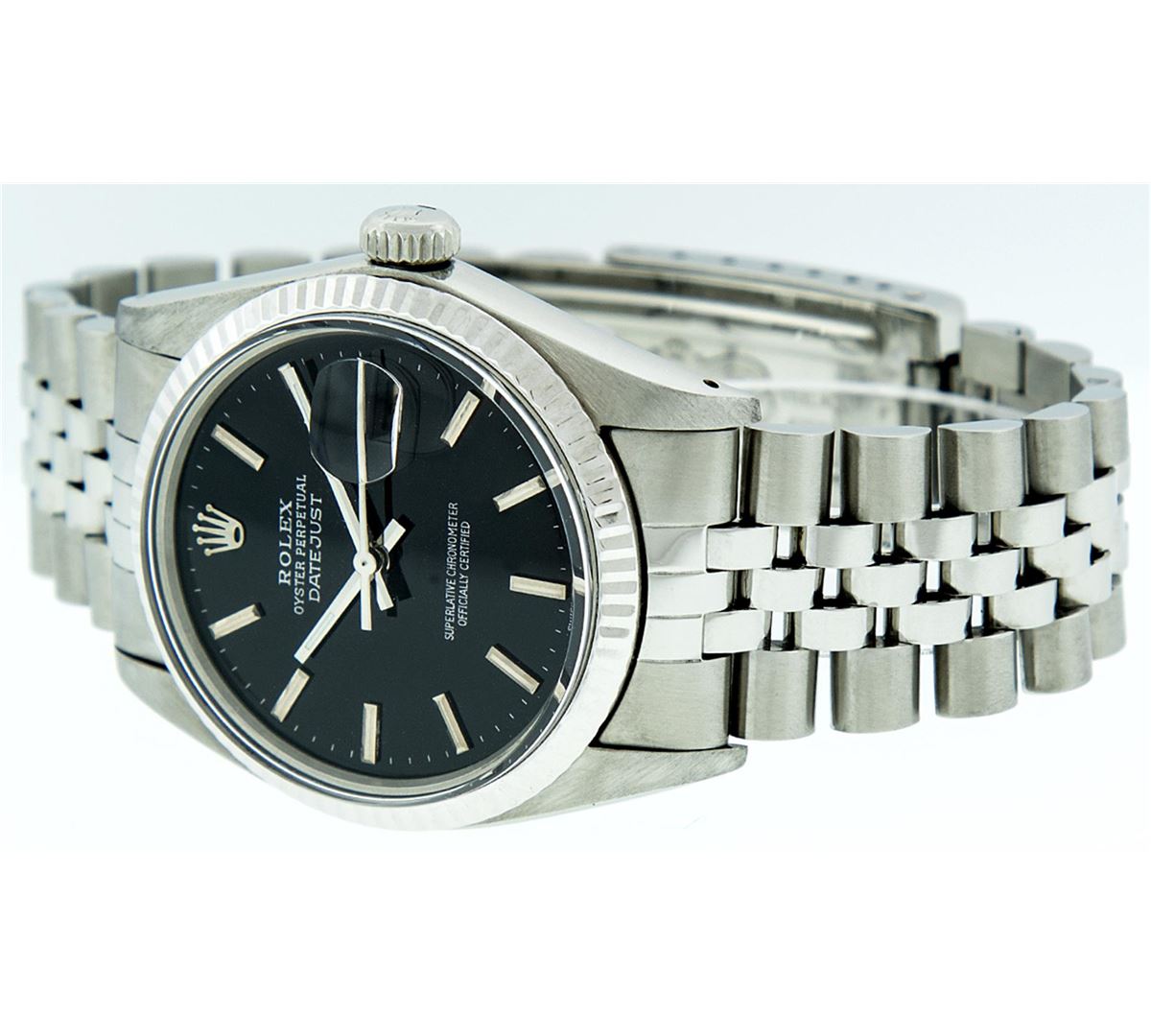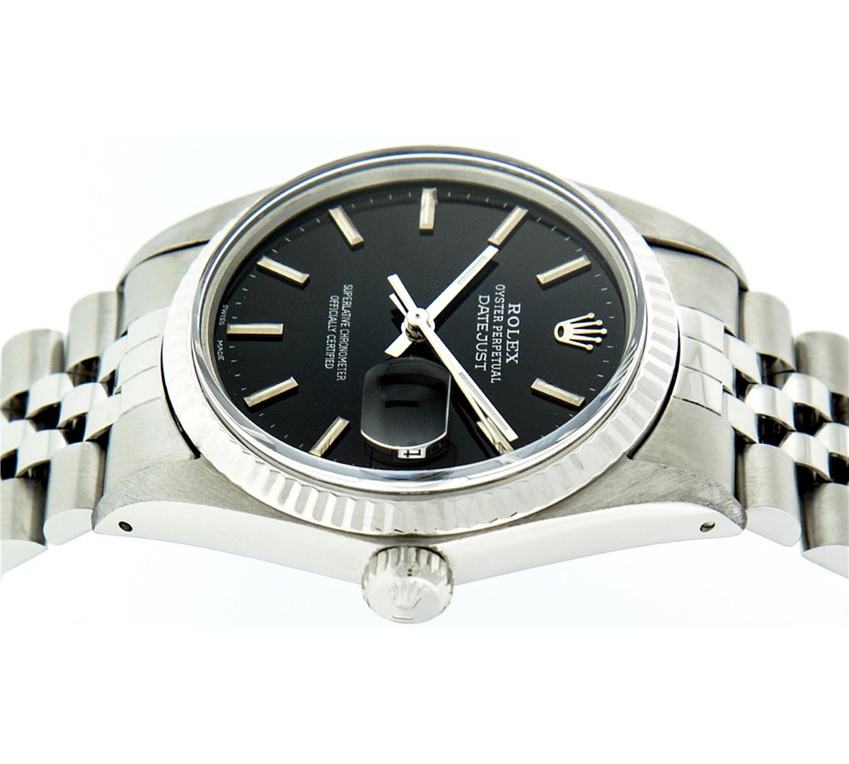 One Gents Rolex Datejust Polished, Serviced & Electronically Tested, Stainless Steel Case:36mm, Stainless Steel Crown, Bezel: 18K White Gold Fluted Bezel. Custom Crystal: Acrylic Cyclops Lens. Movement: Automatic Winding Movement Caliber 3035. Custom Dial: Black Dial With Index Hour Markers. Date Window: 3 O'Clock Position Date Display, Quickset, Model: Datejust, Condition: G-6 Extra Fine. Bracelet: Stainless Steel Jubilee. Bright Polish & Satin Finish. 7.0 Inch Length, Adjustable. Standard Clasp, With Rolex Logo. Comes with 6 month warranty.