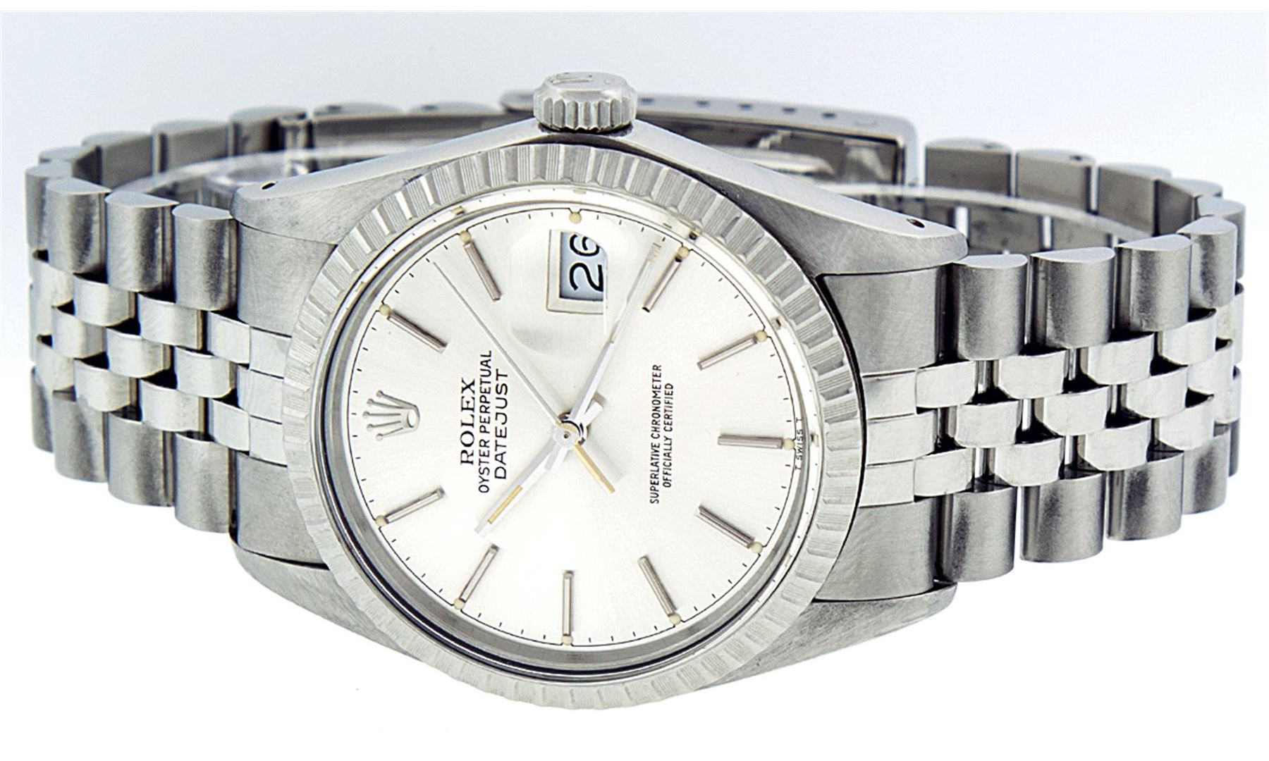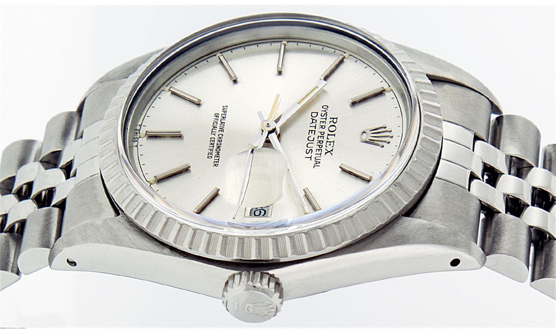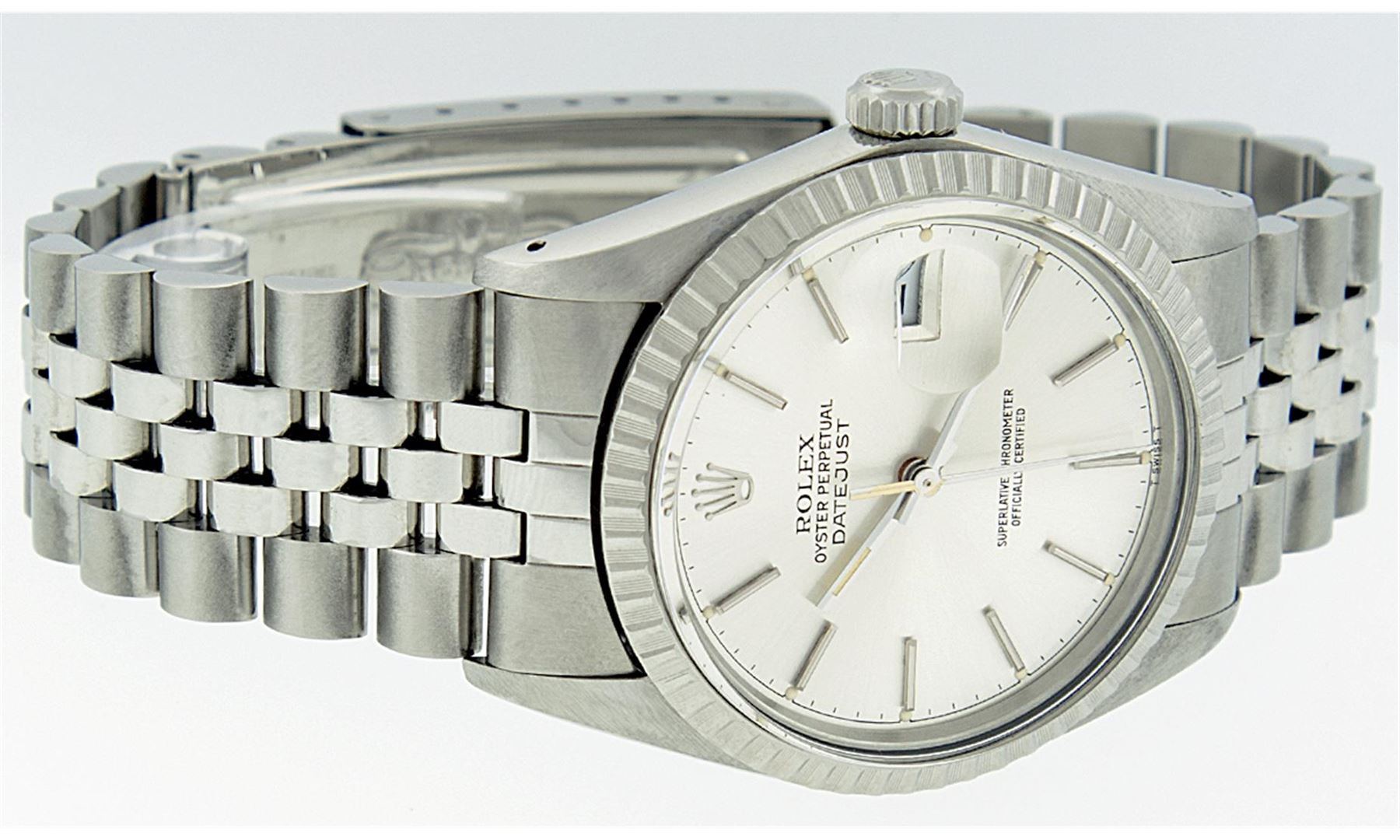 One Gents Rolex Datejust Polished, Serviced & Electronically Tested, Stainless Steel Case:36mm, Stainless Steel Crown, Bezel: 18K White Gold Fluted Bezel. Custom Crystal: Acrylic Cyclops Lens. Movement: Automatic Winding Movement Caliber 3035. Dial: Silver Index With Lumi Dots And Circle Line Track. Date Window: 3 O'Clock Position Date Display, Quickset, Model: Datejust Condition: G-6 Extra Fine. Bracelet: Stainless Steel Jubilee. Bright Polish & Satin Finish. 7 Inch Length, Adjustable. Standard Clasp, With Rolex Logo.