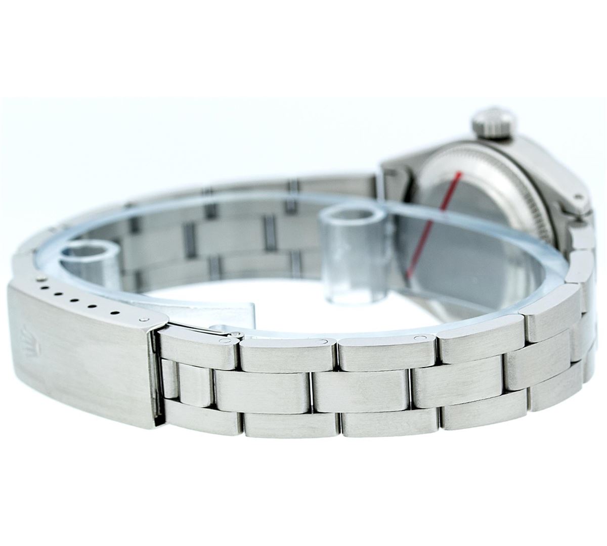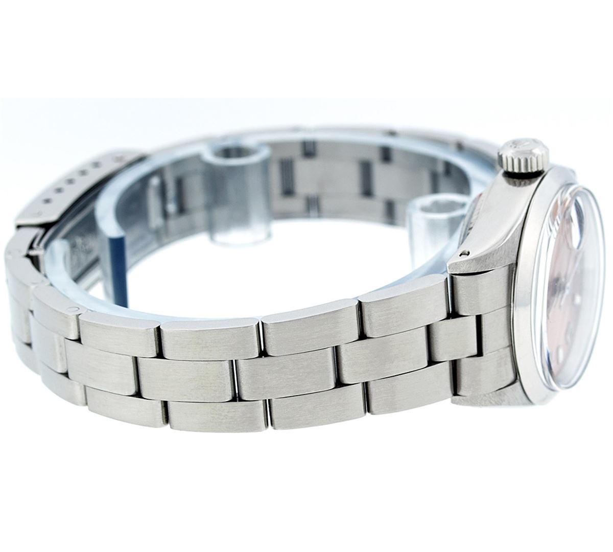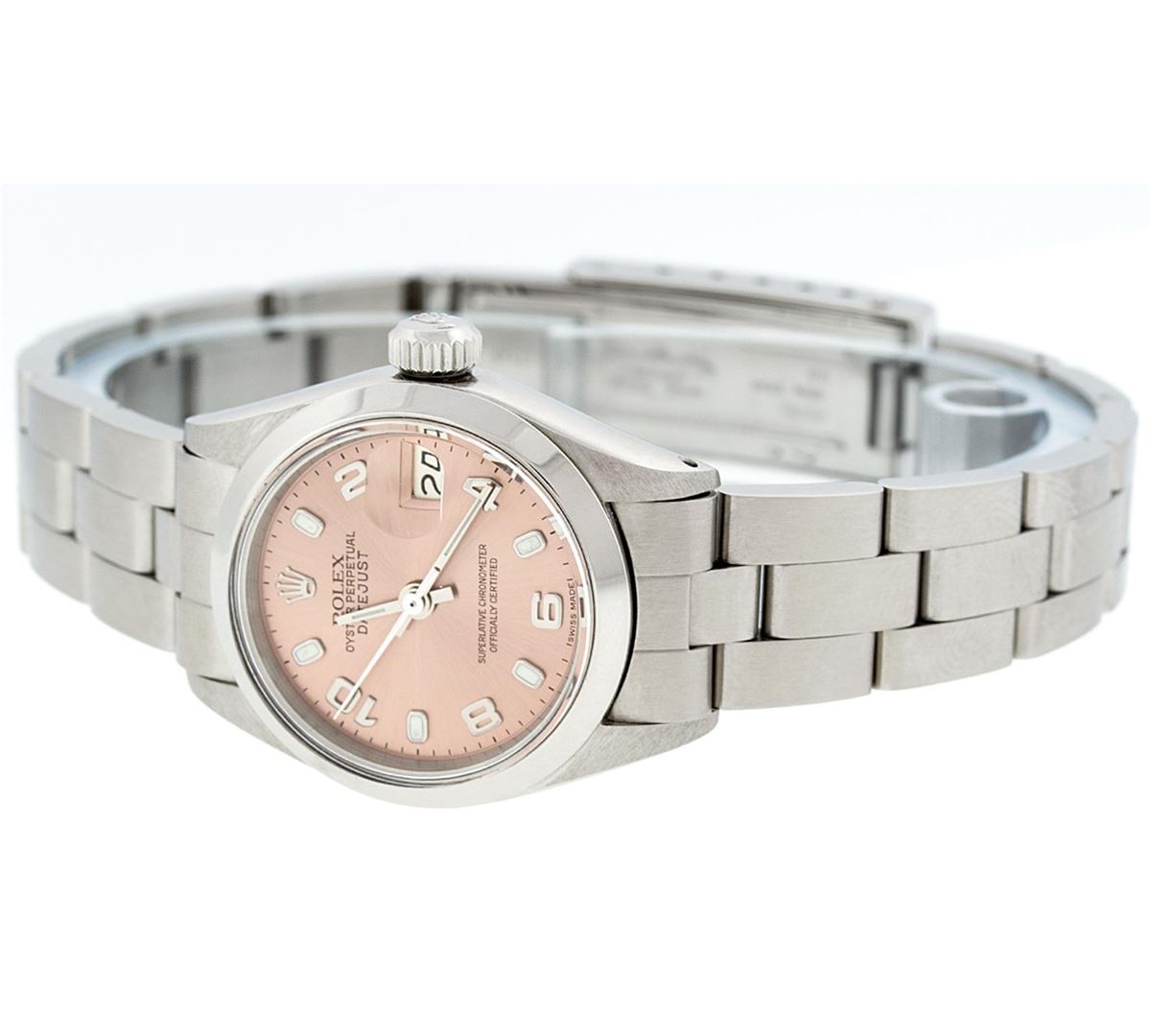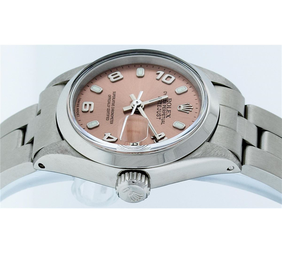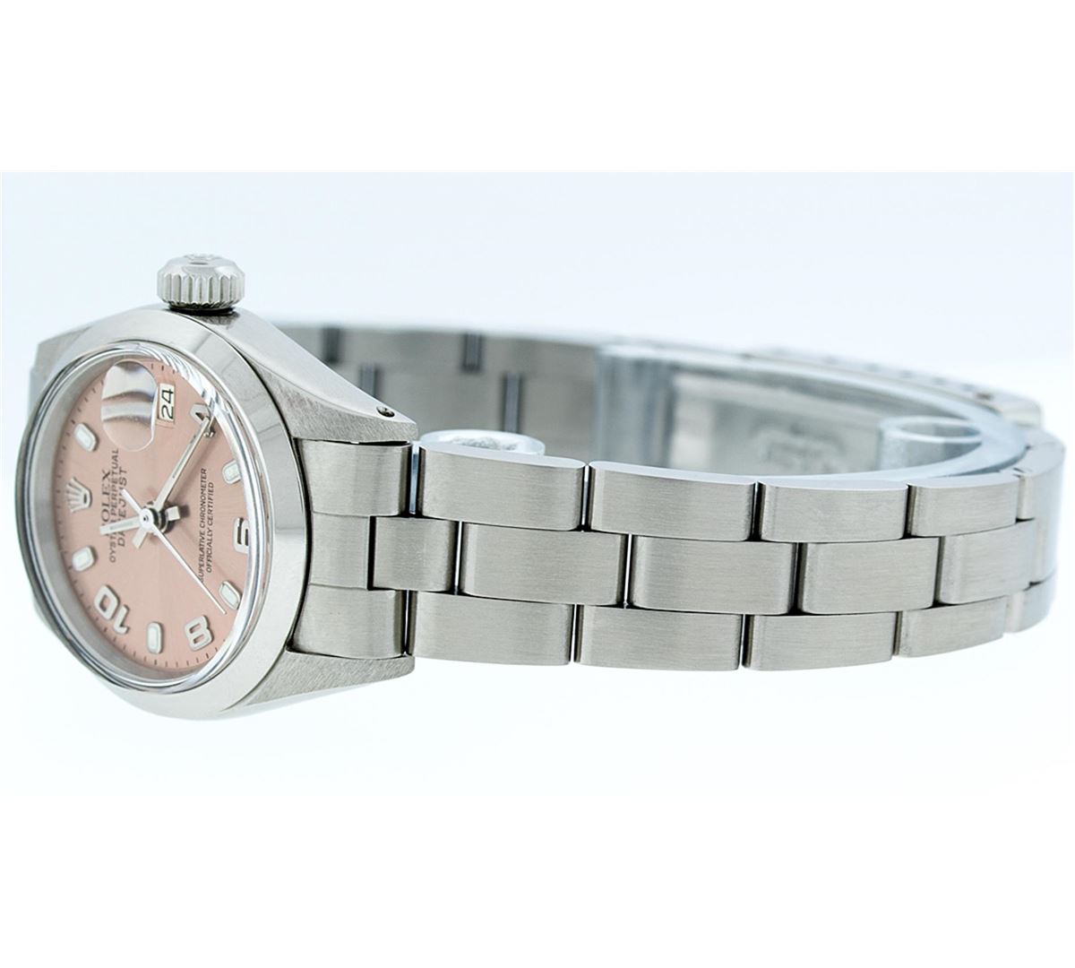 One Ladies Rolex Datejust Polished Bright with Satin Finish, Serviced & Electronically Tested, Stainless Steel Case:26mm, Stainless Steel Crown, Bezel: Stainless Steel Smooth Bezel. Custom Crystal: Acrylic Cyclops Lens. Movement: Automatic Winding Movement Caliber 2030. Dial: Salmon Arabic Dial. Date Window: 3 O'Clock Position Date Display, Model: Datejust. Condition: G-6 Extra Fine. Bracelet: Stainless Steel Oyster Band. Bright Polish & Satin Finish. 6.0 Inch Length, Adjustable. Standard Clasp, With Rolex Logo. Comes with 6 month warranty.