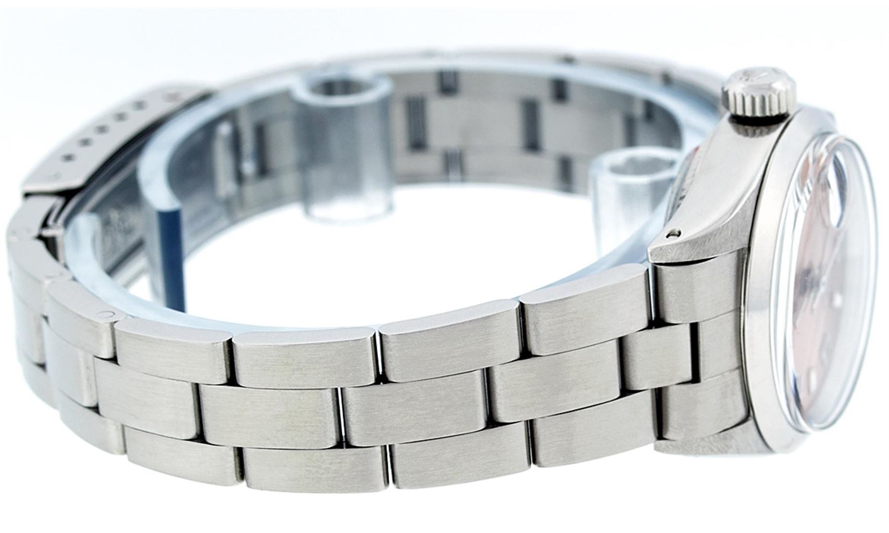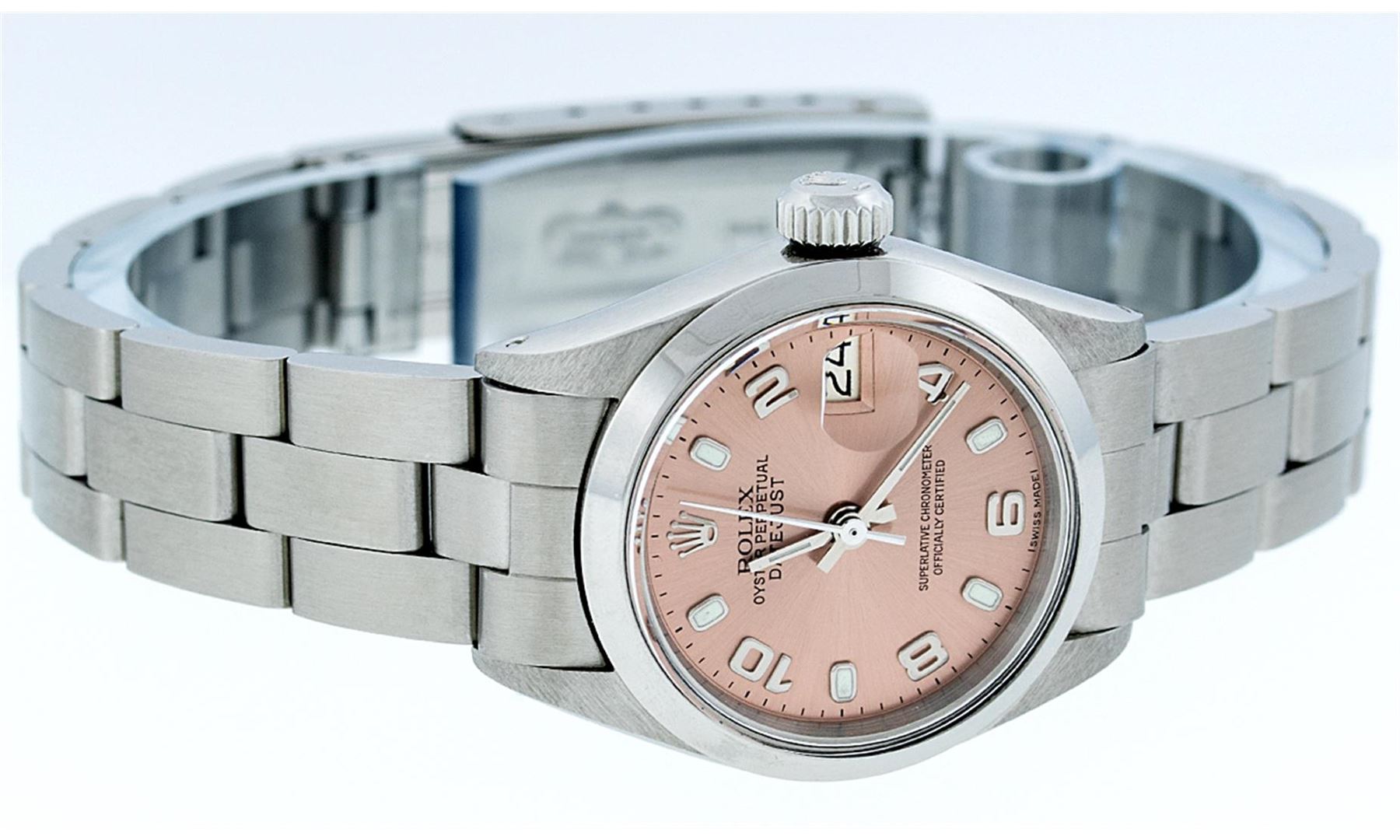 One Ladies Rolex Datejust Polished Bright with Satin Finish, Serviced & Electronically Tested, Stainless Steel Case:26mm, Stainless Steel Crown, Bezel: Stainless Steel Smooth Bezel. Custom Crystal: Acrylic Cyclops Lens. Movement: Automatic Winding Movement Caliber 2030. Dial: Salmon Arabic Dial. Date Window: 3 O'Clock Position Date Display, Model: Datejust. Condition: G-6 Extra Fine. Bracelet: Stainless Steel Oyster Band. Bright Polish & Satin Finish. 6.0 Inch Length, Adjustable. Standard Clasp, With Rolex Logo. Comes with 6 month warranty.