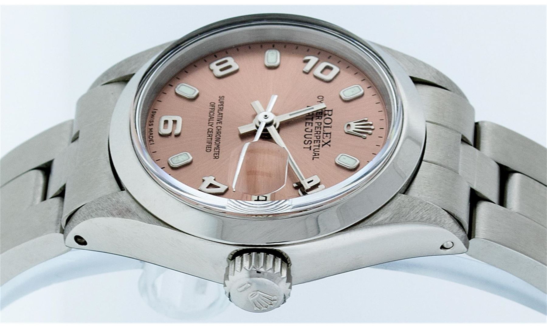 One Ladies Rolex Datejust Polished Bright with Satin Finish, Serviced & Electronically Tested, Stainless Steel Case:26mm, Stainless Steel Crown, Bezel: Stainless Steel Smooth Bezel. Custom Crystal: Acrylic Cyclops Lens. Movement: Automatic Winding Movement Caliber 2030. Dial: Salmon Arabic Dial. Date Window: 3 O'Clock Position Date Display, Model: Datejust. Condition: G-6 Extra Fine. Bracelet: Stainless Steel Oyster Band. Bright Polish & Satin Finish. 6.0 Inch Length, Adjustable. Standard Clasp, With Rolex Logo. Comes with 6 month warranty.