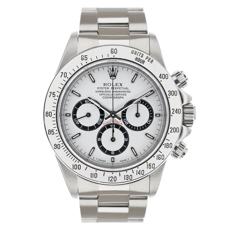 One gents, hand crafted & machine milled Rolex Stainless Steel Daytona Cosmograph wristwatch electronically tested, Crown: twin lock with logo, set within protective shoulders, Chronograph Pushers, Crystal: synthetic sapphire lens, Dial: White, with luminous hands, luminous indices and ringed black chronograph sub dials, Chronograph Functions: hours, minutes, and continuous seconds, Bracelet: Stainless Steel Oyster, with flip-lock clasp, Condition is average.