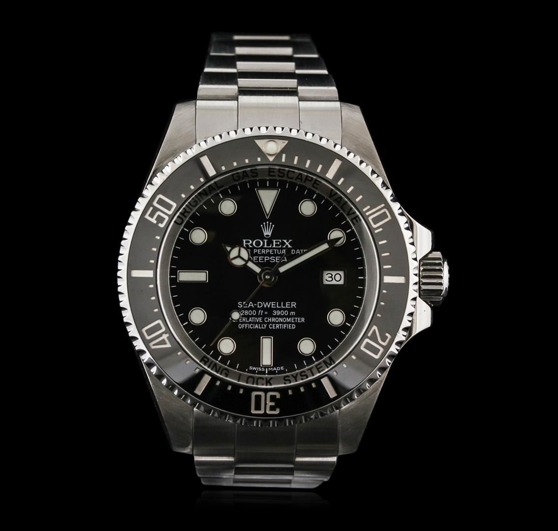One gents, hand crafted & machine milled Rolex Stainless Steel Deep Sea-Dweller DeepSea model wristwatch electronically tested, Case: 44mm oyster, Case Back: engraved with the manufacturers name, logo, model name, and additional information, Water Resistant: 3900 meters / 12800 feet, with a Helium release valve for extreme depth diving, Crown: twin lock with logo, set within protective shoulders, Bezel: uni directional with Black disc, time lapse sixty minute timer, Crystal: synthetic sapphire lens. Case Ring Lock system: the watch can withstand 2.98 metric tonnes of water pressure. Movement: superlative chronometer, Power Reserve: 47 hours, Dial: Black, with luminous hands and indices, Date Window: 3 o'clock position, quick set, Bracelet: stainless steel, Oyster, Glidelock clasp with diver's extension, Condition: G-7 Near Mint. Eight and one half inch length, adjustable. Total Weight of Watch 209.30 grams. Includes box and papers. AIG Appraised at $12,050.00.