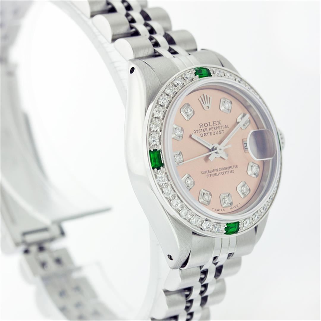 One Ladies Rolex Datejust Polished Bright with Satin Finish, Serviced & Electronically Tested, Stainless Steel Case:26mm, Stainless Steel Crown, Custom Bezel: 18K White Gold Emerald Beadset Diamond Bezel, Diamond + Gem Count: 28 Diamonds + 4 Emeralds Total Weight .70 Carat, Clarity: SI-VS, Color: G to H. Custom Crystal: Synthetic Sapphire Cyclops Lens. Movement: Automatic Winding Movement Caliber 2030. Custom Dial: Salmon Diamond Dial, Diamond Count: 10 Diamonds, Clarity: SI-VS, Color: G to H. Date Window: 3 O'Clock Position Date Display, Non Quickset, Model: Datejust, Condition: G-6 Extra Fine. Bracelet: Stainless Steel Jubilee. Bright Polish & Satin Finish. 5.5 Inch Length, Adjustable. Standard Clasp, With Rolex Logo.