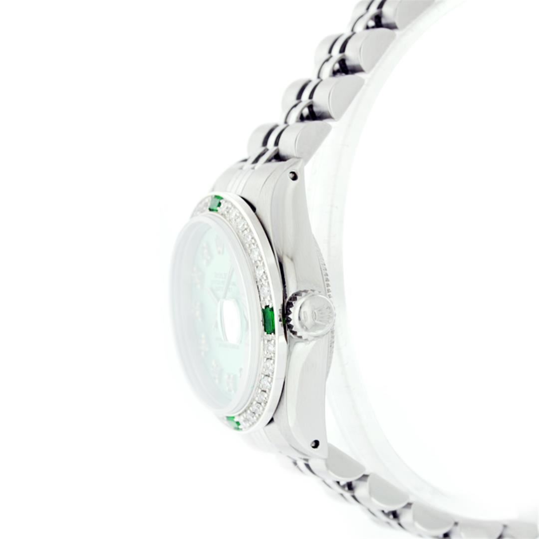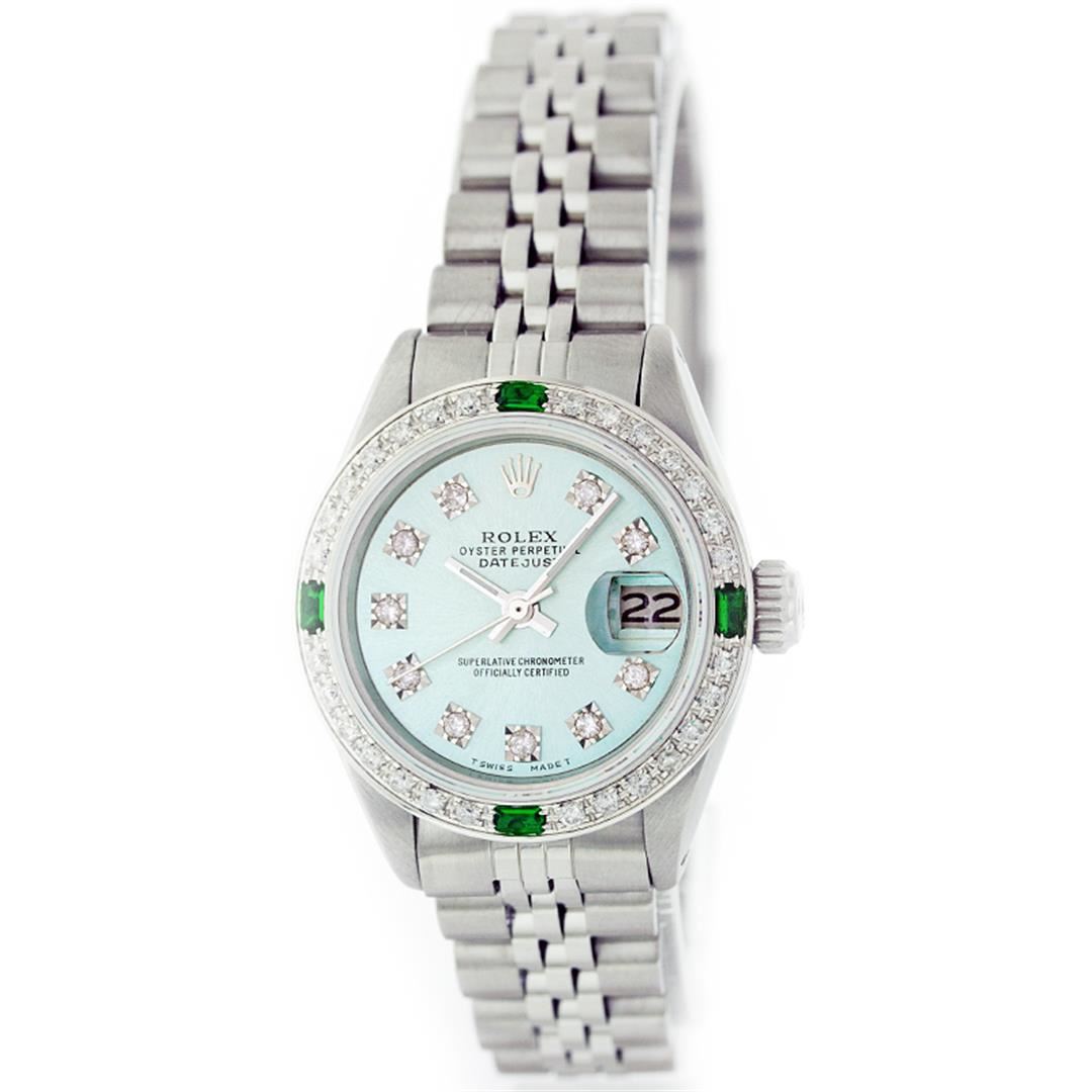 One Ladies Rolex Datejust Polished Bright with Satin Finish, Serviced & Electronically Tested, Stainless Steel Case:26mm, Stainless Steel Crown, Custom Bezel: 18K White Gold Emerald Beadset Diamond Bezel, Diamond + Gem Count: 28 Diamonds + 4 Emeralds Total Weight .70 Carat, Clarity: SI-VS, Color: G to H. Custom Crystal: Synthetic Sapphire Cyclops Lens. Movement: Automatic Winding Movement Caliber 2030. Custom Dial: Ice Green Diamond Dial, Diamond Count: 10 Diamonds, Clarity: SI-VS, Color: G to H. Date Window: 3 O'Clock Position Date Display, Non Quickset, Model: Datejust, Condition: G-6 Extra Fine. Bracelet: Stainless Steel Jubilee. Bright Polish & Satin Finish. 5.5 Inch Length, Adjustable. Standard Clasp, With Rolex Logo.