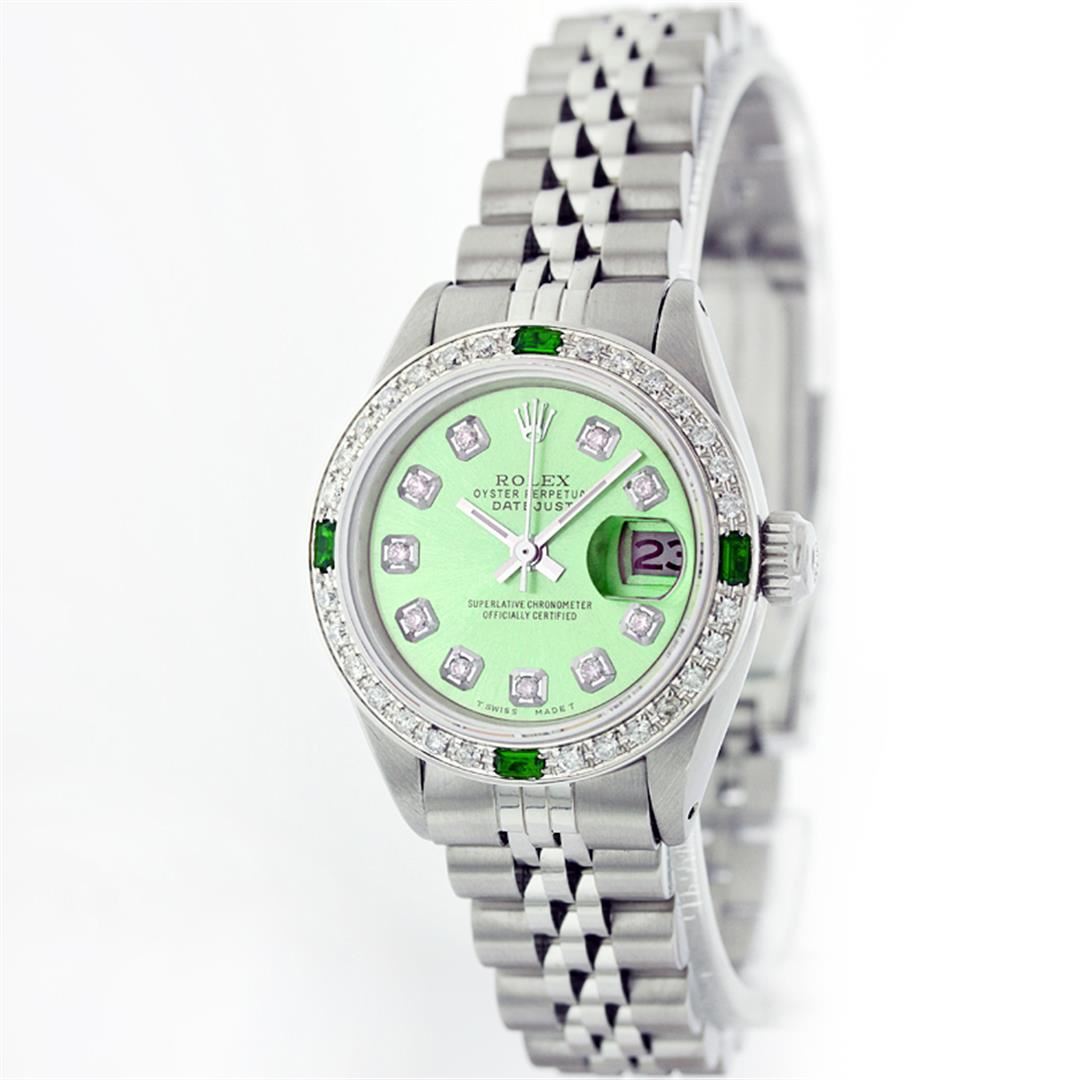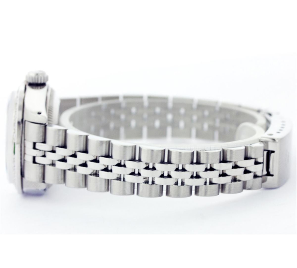 One Ladies Rolex Datejust Polished Bright with Satin Finish, Serviced & Electronically Tested, Stainless Steel Case:26mm, Stainless Steel Crown, Custom Bezel: 18K White Gold Emerald Beadset Diamond Bezel, Diamond + Gem Count: 28 Diamonds + 4 Emeralds Total Weight .70 Carat, Clarity: SI-VS, Color: G to H. Custom Crystal: Synthetic Sapphire Cyclops Lens. Movement: Automatic Winding Movement Caliber 2030. Custom Dial: Green Diamond Dial, Diamond Count: 10 Diamonds, Clarity: SI-VS, Color: G to H. Date Window: 3 O'Clock Position Date Display, Non Quickset, Model: Datejust, Condition: G-6 Extra Fine. Bracelet: Stainless Steel Jubilee. Bright Polish & Satin Finish. 5.5 Inch Length, Adjustable. Standard Clasp, With Rolex Logo.
