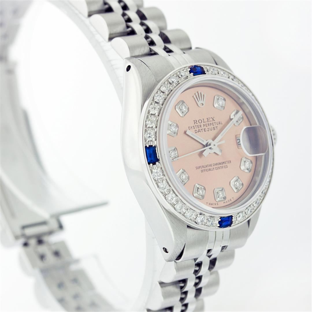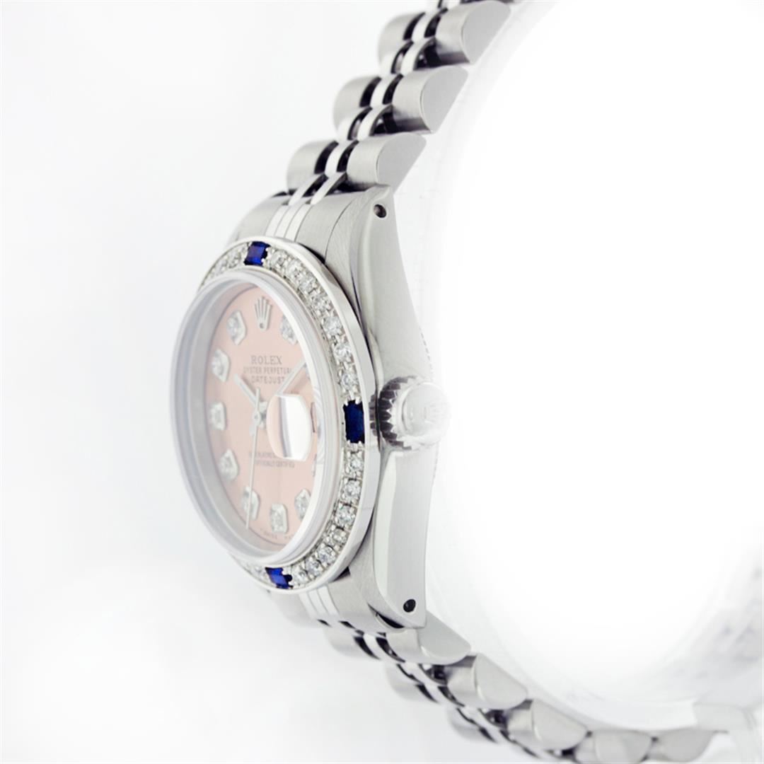 One Ladies Rolex Datejust Polished Bright with Satin Finish, Serviced & Electronically Tested, Stainless Steel Case:26mm, Stainless Steel Crown, Custom Bezel: 18K White Gold Sapphire Beadset Diamond Bezel, Diamond + Gem Count: 28 Diamonds + 4 Sapphires Total Weight .70 Carat, Clarity: SI-VS, Color: G to H. Custom Crystal: Synthetic Sapphire Cyclops Lens. Movement: Automatic Winding Movement Caliber 2030. Custom Dial: Salmon Diamond Dial, Diamond Count: 10 Diamonds, Clarity: SI-VS, to H. Date Window: 3 O'Clock Position Date Display, Non Quickset, Model: Datejust, Condition: G-6 Extra Fine. Bracelet: Stainless Steel Jubilee. Bright Polish & Satin Finish. 5.5 Inch Length, Adjustable. Standard Clasp, With Rolex Logo.