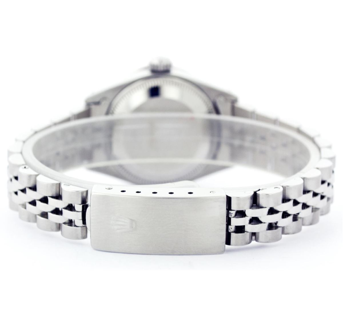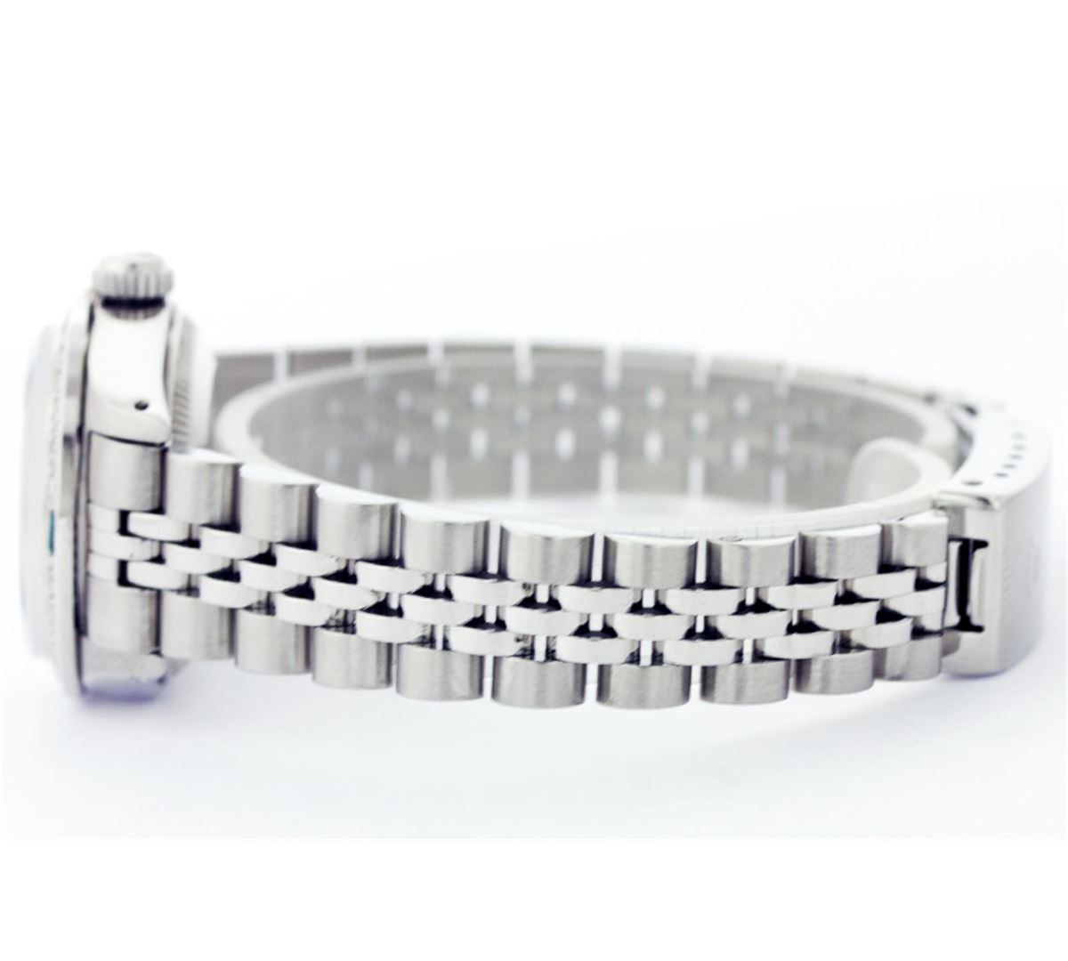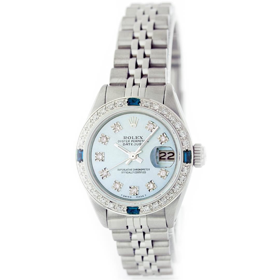 One Ladies Rolex Datejust Polished Bright with Satin Finish, Serviced & Electronically Tested, Stainless Steel Case:26mm, Stainless Steel Crown, Custom Bezel: 18K White Gold Sapphire Beadset Diamond Bezel, Diamond + Gem Count: 28 Diamonds + 4 Sapphires Total Weight .70 Carat, Clarity: SI-VS, Color: G to H. Custom Crystal: Synthetic Sapphire Cyclops Lens. Movement: Automatic Winding Movement Caliber 2030. Custom Dial: Ice Blue Diamond Dial, Diamond Count: 10 Diamonds, Clarity: SI-VS, to H. Date Window: 3 O'Clock Position Date Display, Non Quickset, Model: Datejust, Condition: G-6 Extra Fine. Bracelet: Stainless Steel Jubilee. Bright Polish & Satin Finish. 5.5 Inch Length, Adjustable. Standard Clasp, With Rolex Logo.