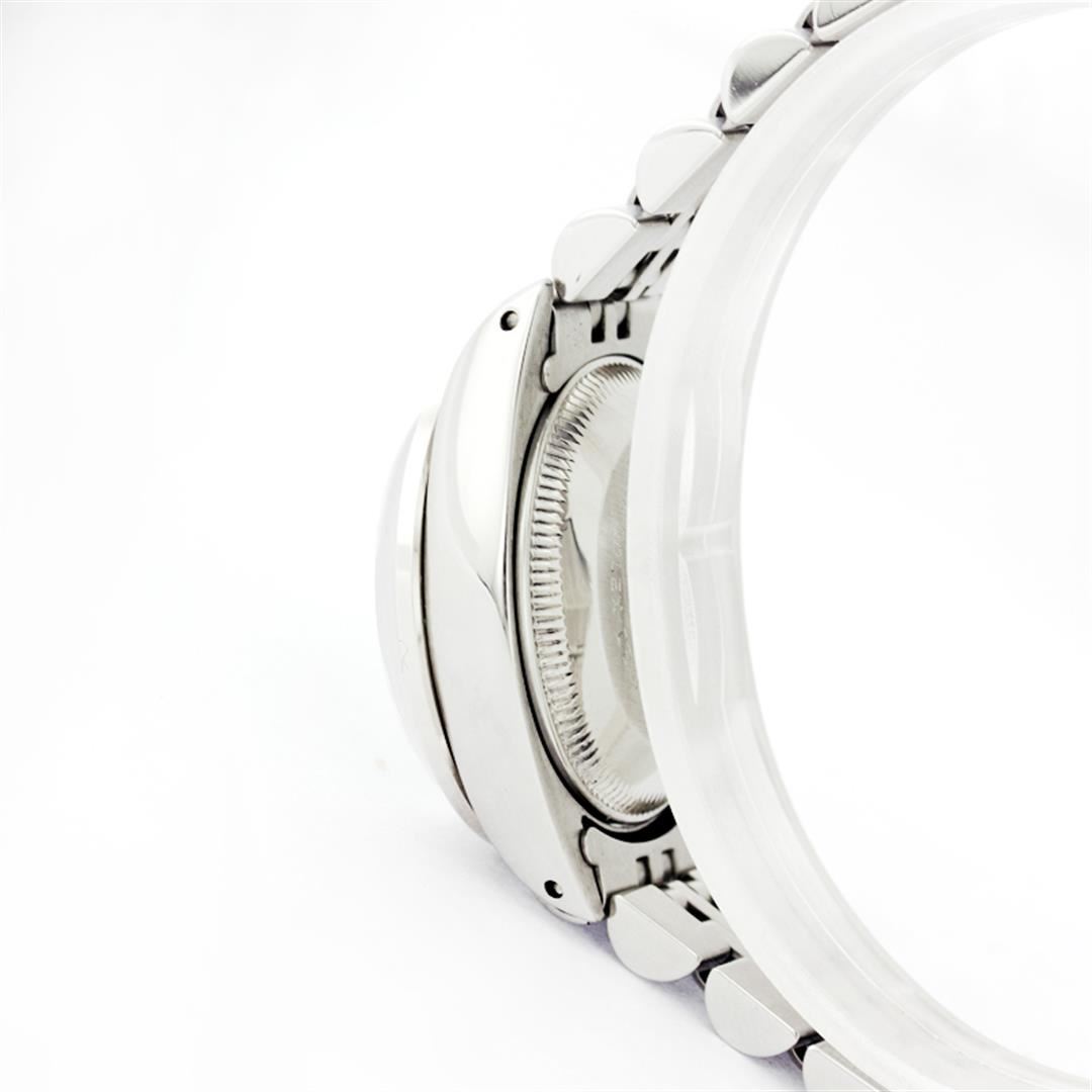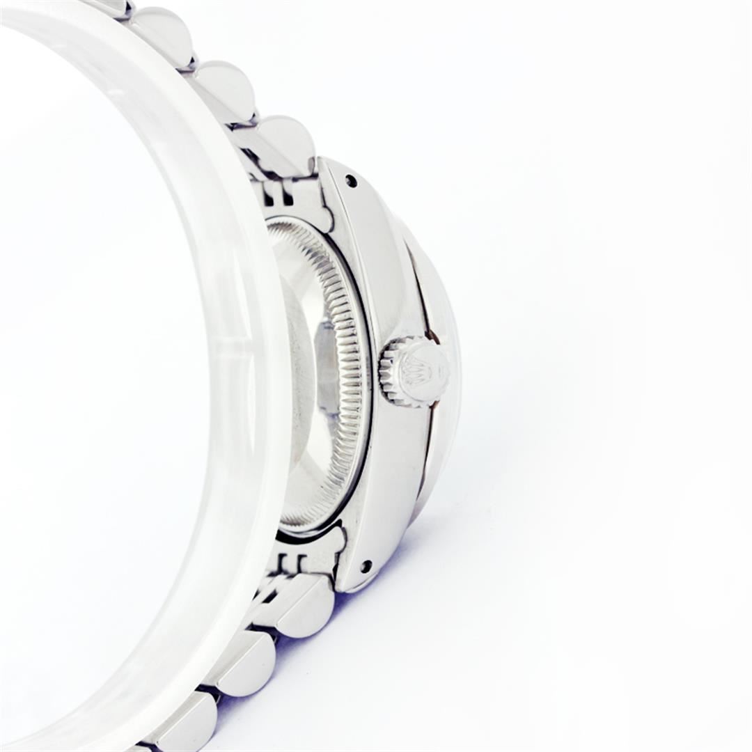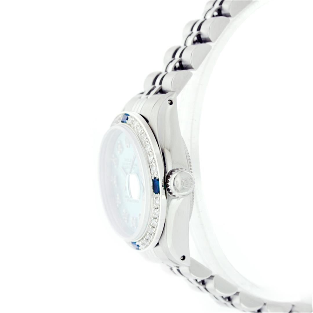 One Ladies Rolex Datejust Polished Bright with Satin Finish, Serviced & Electronically Tested, Stainless Steel Case:26mm, Stainless Steel Crown, Custom Bezel: 18K White Gold Sapphire Beadset Diamond Bezel, Diamond + Gem Count: 28 Diamonds + 4 Sapphires Total Weight .70 Carat, Clarity: SI-VS, Color: G to H. Custom Crystal: Synthetic Sapphire Cyclops Lens. Movement: Automatic Winding Movement Caliber 2030. Custom Dial: Ice Blue Diamond Dial, Diamond Count: 10 Diamonds, Clarity: SI-VS, to H. Date Window: 3 O'Clock Position Date Display, Non Quickset, Model: Datejust, Condition: G-6 Extra Fine. Bracelet: Stainless Steel Jubilee. Bright Polish & Satin Finish. 5.5 Inch Length, Adjustable. Standard Clasp, With Rolex Logo.