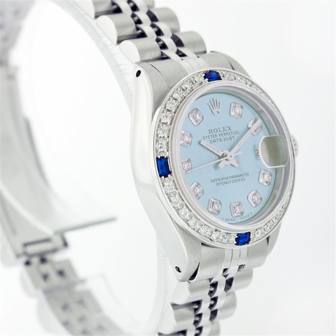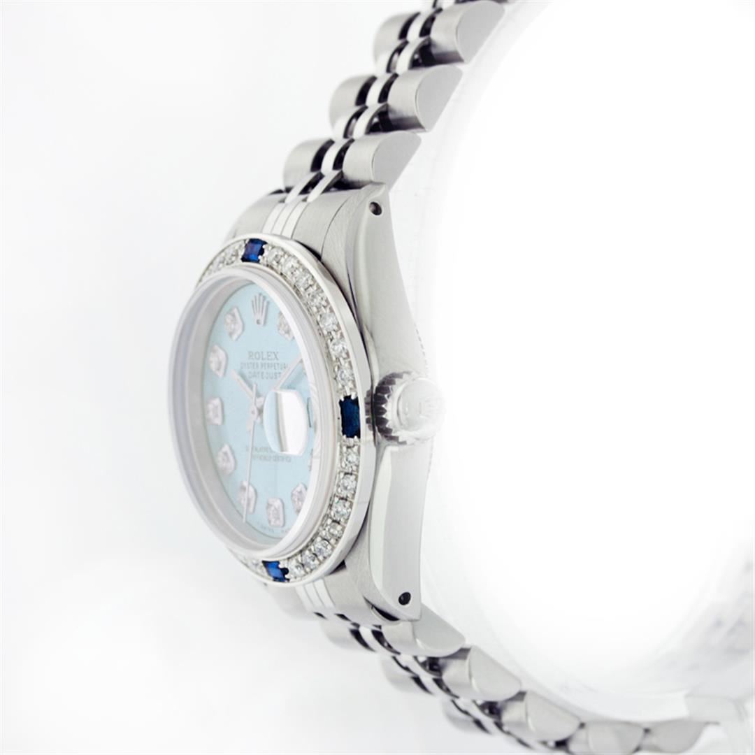 One Ladies Rolex Datejust Polished Bright with Satin Finish, Serviced & Electronically Tested, Stainless Steel Case:26mm, Stainless Steel Crown, Custom Bezel: 18K White Gold Sapphire Beadset Diamond Bezel, Diamond + Gem Count: 28 Diamonds + 4 Sapphires Total Weight .70 Carat, Clarity: SI-VS, Color: G to H. Custom Crystal: Synthetic Sapphire Cyclops Lens. Movement: Automatic Winding Movement Caliber 2030. Custom Dial: Ice Blue Diamond Dial, Diamond Count: 10 Diamonds, Clarity: SI-VS, to H. Date Window: 3 O'Clock Position Date Display, Non Quickset, Model: Datejust, Condition: G-6 Extra Fine. Bracelet: Stainless Steel Jubilee. Bright Polish & Satin Finish. 5.5 Inch Length, Adjustable. Standard Clasp, With Rolex Logo.