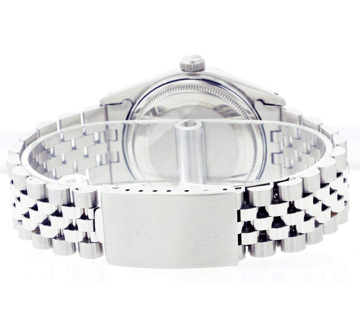 One Gents Rolex Datejust Polished, Serviced & Electronically Tested, Stainless Steel Case:36mm, Stainless Steel Crown, Custom Bezel: 18K White Gold Sapphire Beadset Diamond Bezel, Diamond + Gem Count: 36 Diamonds + 4 Sapphires Total Weight 1.00 Carat, Clarity: SI-VS, Color: G to H. Custom Crystal: Synthetic Sapphire Cyclops Lens. Movement: Automatic Winding Movement Caliber 3035. Custom Dial: Mother Of Pearl With Diamond Hour Markers, 10 Diamond Dial G To H In Color, Clarity: SI-VS. Date Window: 3 O'Clock Position Date Display, Quickset, Model: 16014 Condition: G-6 Extra Fine. Bracelet: Stainless Steel Jubilee. Bright Polish & Satin Finish. 6.5 Inch Length, Adjustable. Standard Clasp, With Rolex Logo.
