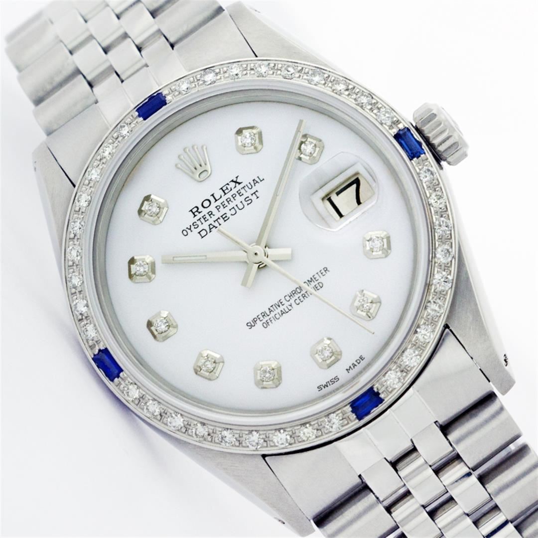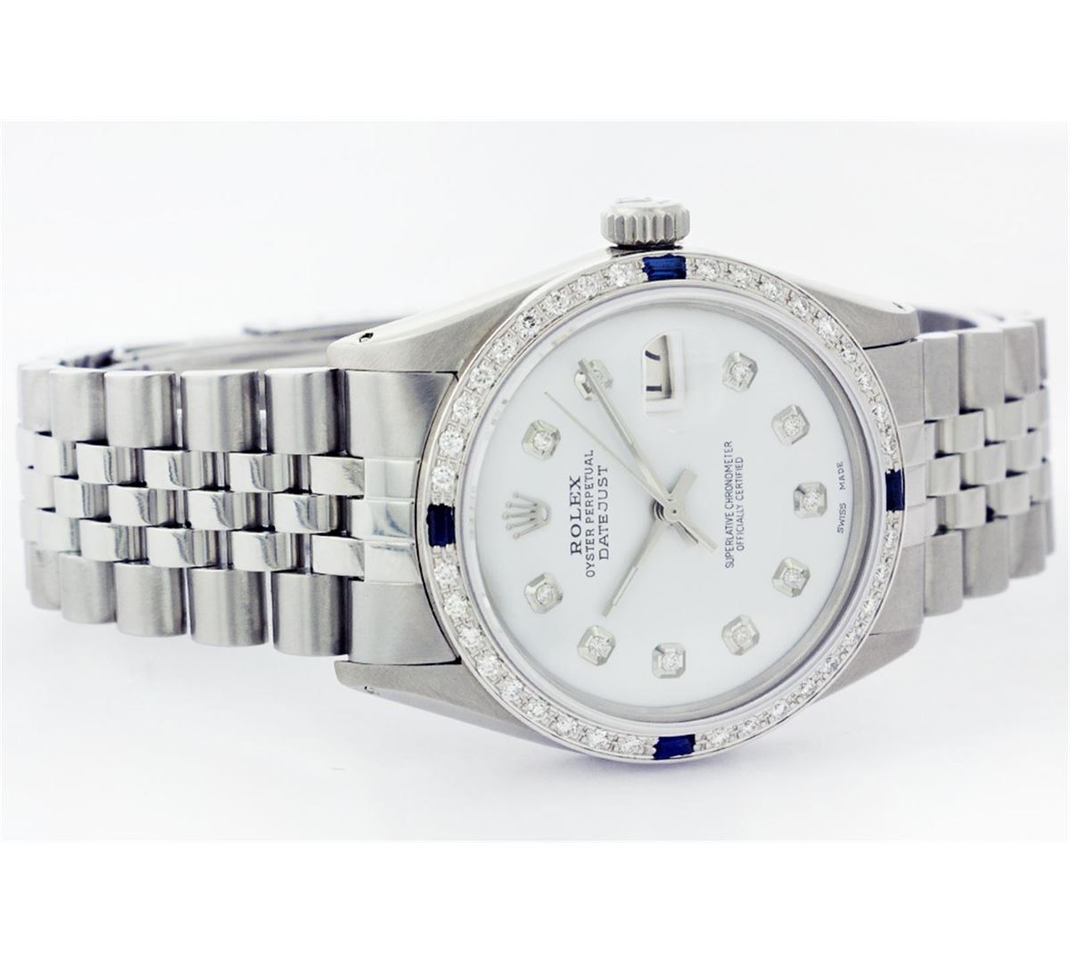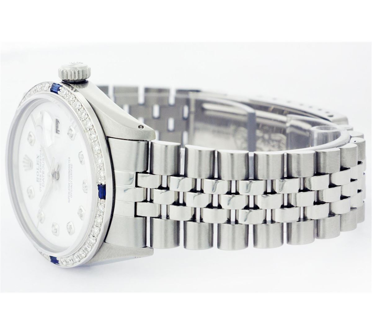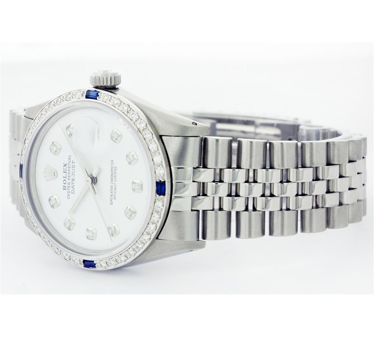 One Mens Rolex Datejust Polished, Serviced & Electronically Tested, Stainless Steel Case:36mm, Stainless Steel Crown, Custom Bezel: 18K White Gold Sapphire Beadset Diamond Bezel, Diamond + Gem Count: 36 Diamonds + 4 Sapphires Total Weight 1.00 Carat, Clarity: SI-VS, Color: G to H. Crystal: Synthetic Sapphire Cyclops Lens. Movement: Automatic Winding Movement Caliber 3135. Custom Dial: Mother Of Pearl With Diamond Hour Markers, 10 Diamonds In Dial G To H In Color, Clarity: SI-VS. Date Window: 3 O'Clock Position Date Display, Quickset, Model: 16234 Condition: G-6 Extra Fine. Bracelet: Stainless Steel Jubilee. Bright Polish & Satin Finish. 6.5 Inch Length, Adjustable. Standard Clasp, With Rolex Logo.
