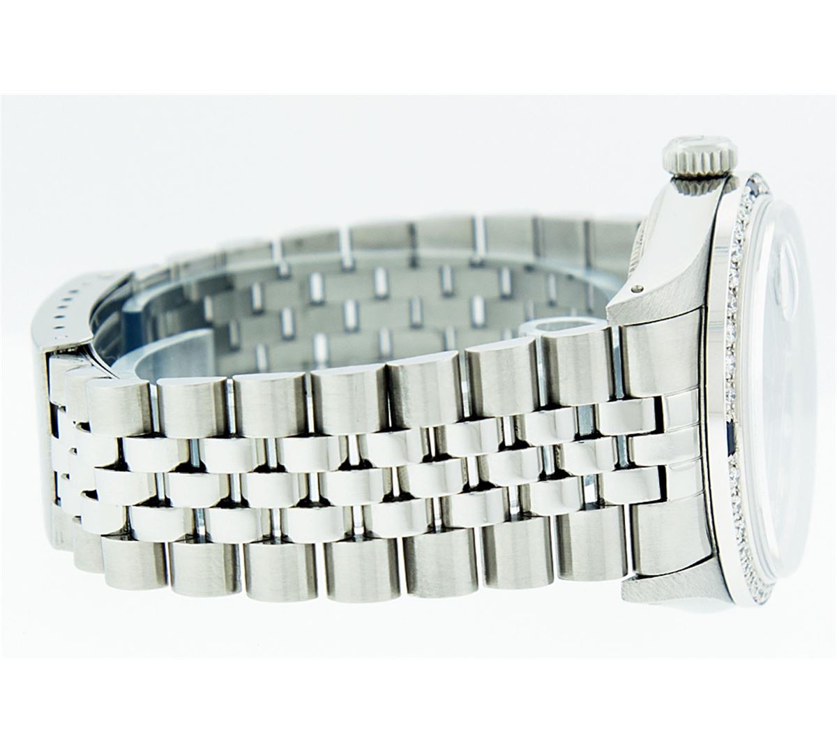 One Gents Rolex Datejust Polished, Serviced & Electronically Tested, Stainless Steel Case:36mm, Stainless Steel Crown, Custom Bezel: 18K White Gold Sapphire Beadset Diamond Bezel, Diamond + Gem Count: 36 Diamonds + 4 Sapphires Total Weight 1.00 Carat, Clarity: SI-VS, Color: G to H. Custom Crystal: Synthetic Sapphire Cyclops Lens. Movement: Automatic Winding Movement Caliber 3035. Custom Dial: Blue Diamond Dial With Small Track, Diamond Count: 10 Diamond Dial G To H In Color, Clarity: SI-VS. Date Window: 3 O'Clock Position Date Display, Quickset, Model: 16014 Condition: G-6 Extra Fine. Bracelet: Stainless Steel Jubilee. Bright Polish & Satin Finish. 6.5 Inch Length, Adjustable. Standard Clasp, With Rolex Logo.