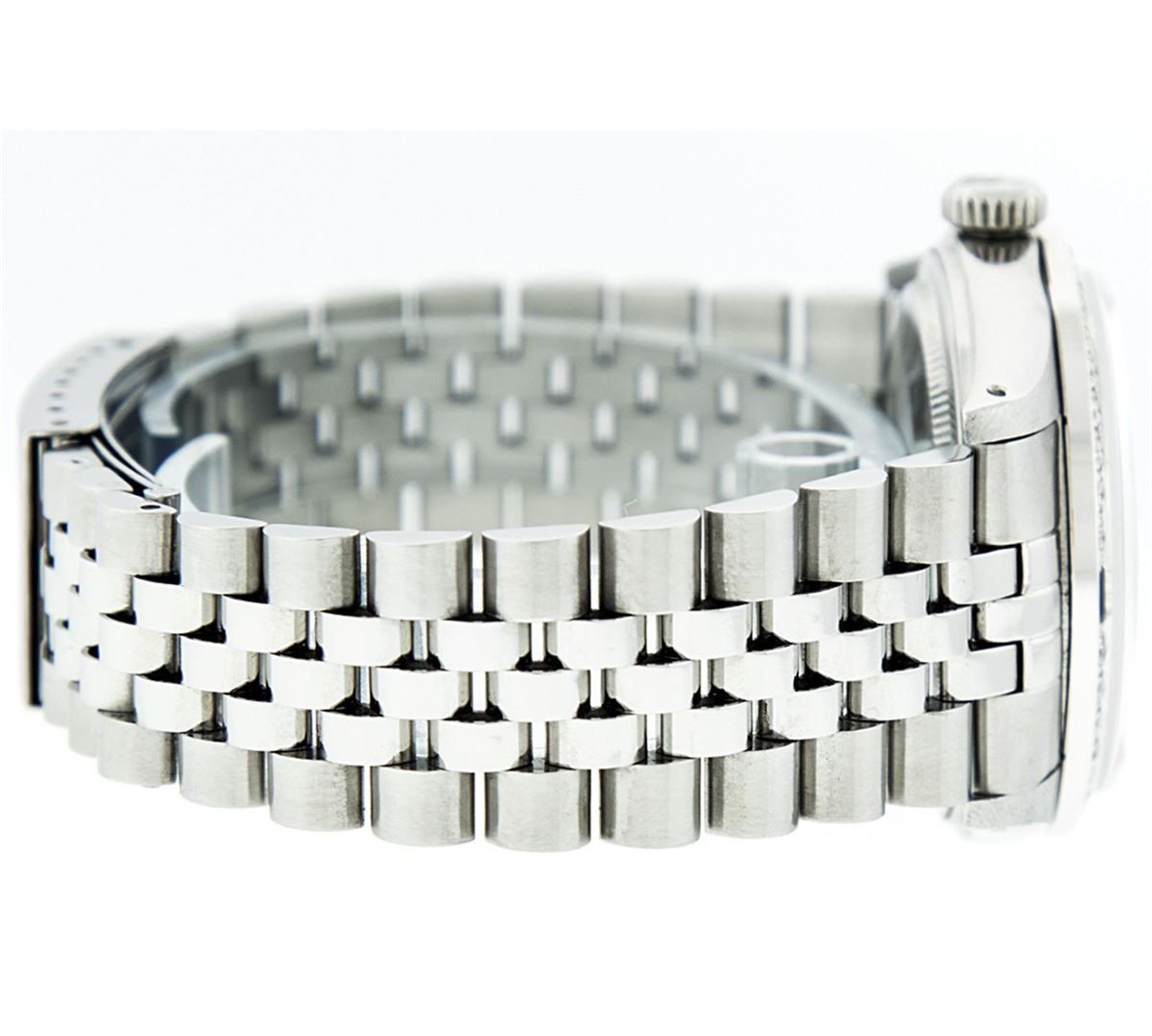 One Gents Rolex Datejust Polished, Serviced & Electronically Tested, Stainless Steel Case:36mm, Stainless Steel Crown, Custom Bezel: 18K White Gold Sapphire Beadset Diamond Bezel, Diamond + Gem Count: 36 Diamonds + 4 Sapphires Total Weight 1.00 Carat, Clarity: SI-VS, Color: G to H. Custom Crystal: Synthetic Sapphire Cyclops Lens. Movement: Automatic Winding Movement Caliber 3035. Custom Dial: Blue Vignette With VVS Diamond Hour Markers and Roman Square Track, 10 Diamond Dial G To H In Color, Clarity: VVS. Date Window: 3 O'Clock Position Date Display, Quickset, Model: 16014 Condition: G-6 Extra Fine. Bracelet: Stainless Steel Jubilee. Bright Polish & Satin Finish. 6.5 Inch Length, Adjustable. Standard Clasp, With Rolex Logo.