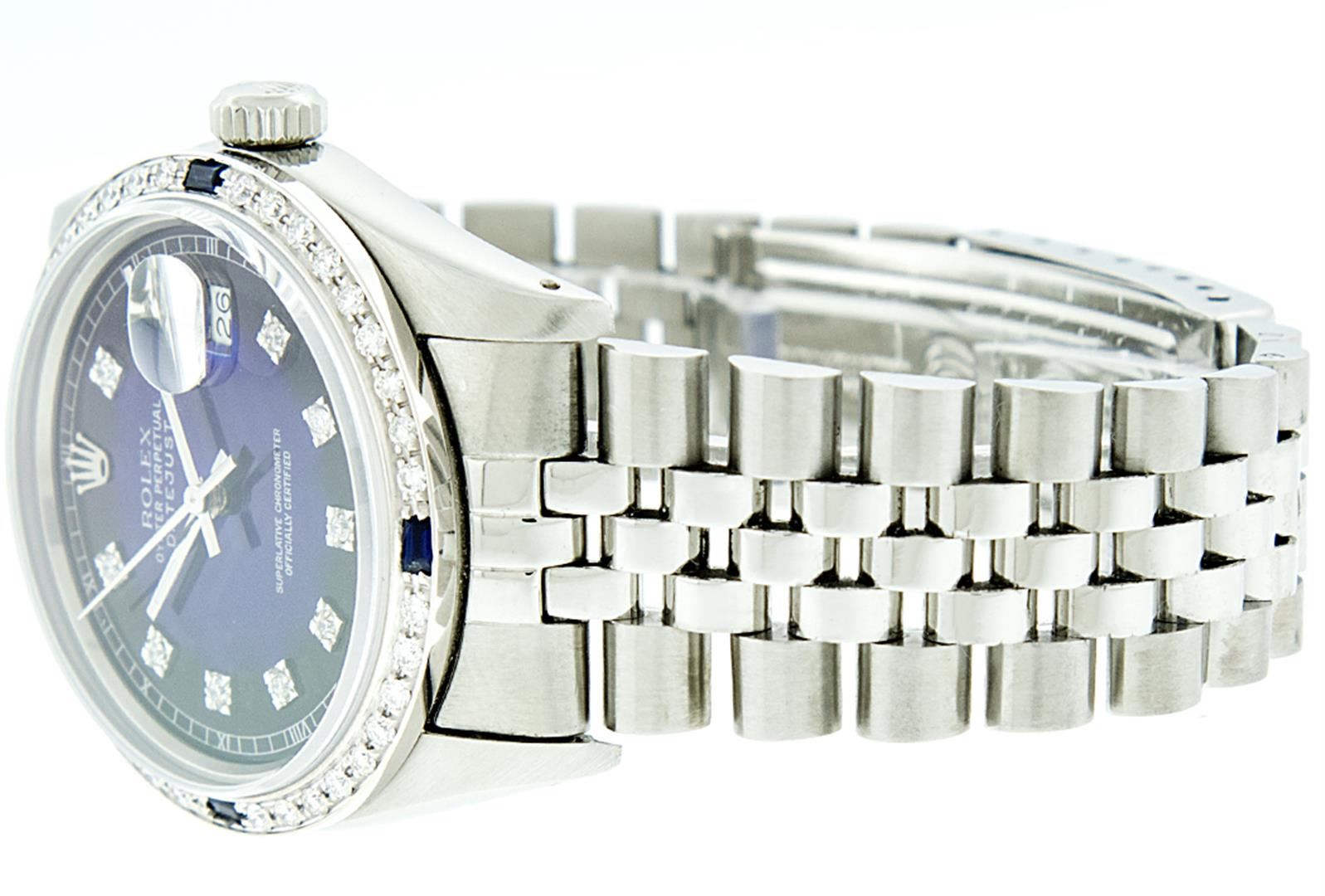 One Gents Rolex Datejust Polished, Serviced & Electronically Tested, Stainless Steel Case:36mm, Stainless Steel Crown, Custom Bezel: 18K White Gold Sapphire Beadset Diamond Bezel, Diamond + Gem Count: 36 Diamonds + 4 Sapphires Total Weight 1.00 Carat, Clarity: SI-VS, Color: G to H. Crystal: Synthetic Sapphire Cyclops Lens. Movement: Automatic Winding Movement Caliber 3135. Custom Dial: Blue Vignette With VVS Diamond Hour Markers and Roman Square Track, 10 Diamonds In Dial G To H In Color, Clarity: VVS. Date Window: 3 O'Clock Position Date Display, Quickset, Model: 16234 Condition: G-6 Extra Fine. Bracelet: Stainless Steel Jubilee. Bright Polish & Satin Finish. 6.5 Inch Length, Adjustable. Standard Clasp, With Rolex Logo.