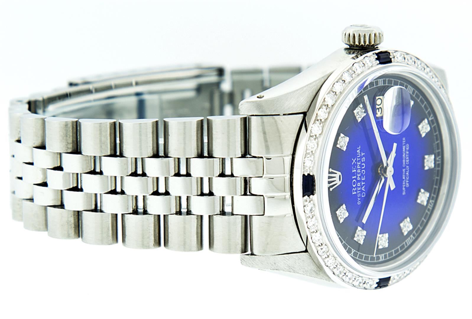 One Gents Rolex Datejust Polished, Serviced & Electronically Tested, Stainless Steel Case:36mm, Stainless Steel Crown, Custom Bezel: 18K White Gold Sapphire Beadset Diamond Bezel, Diamond + Gem Count: 36 Diamonds + 4 Sapphires Total Weight 1.00 Carat, Clarity: SI-VS, Color: G to H. Custom Crystal: Synthetic Sapphire Cyclops Lens. Movement: Automatic Winding Movement Caliber 3035. Custom Dial: Blue Vignette With VVS Diamond Hour Markers and Roman Square Track, 10 Diamond Dial G To H In Color, Clarity: VVS. Date Window: 3 O'Clock Position Date Display, Quickset, Model: 16014 Condition: G-6 Extra Fine. Bracelet: Stainless Steel Jubilee. Bright Polish & Satin Finish. 6.5 Inch Length, Adjustable. Standard Clasp, With Rolex Logo.