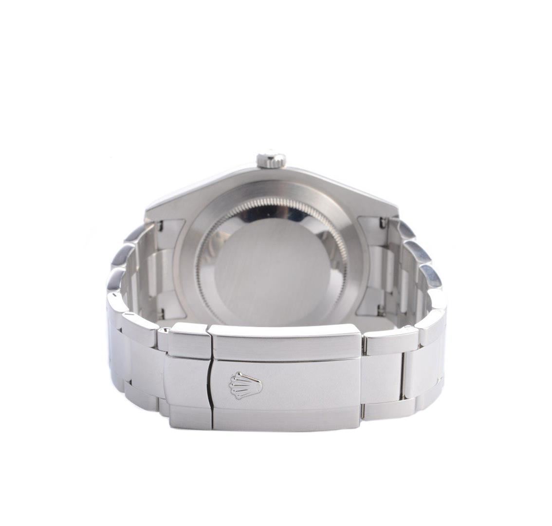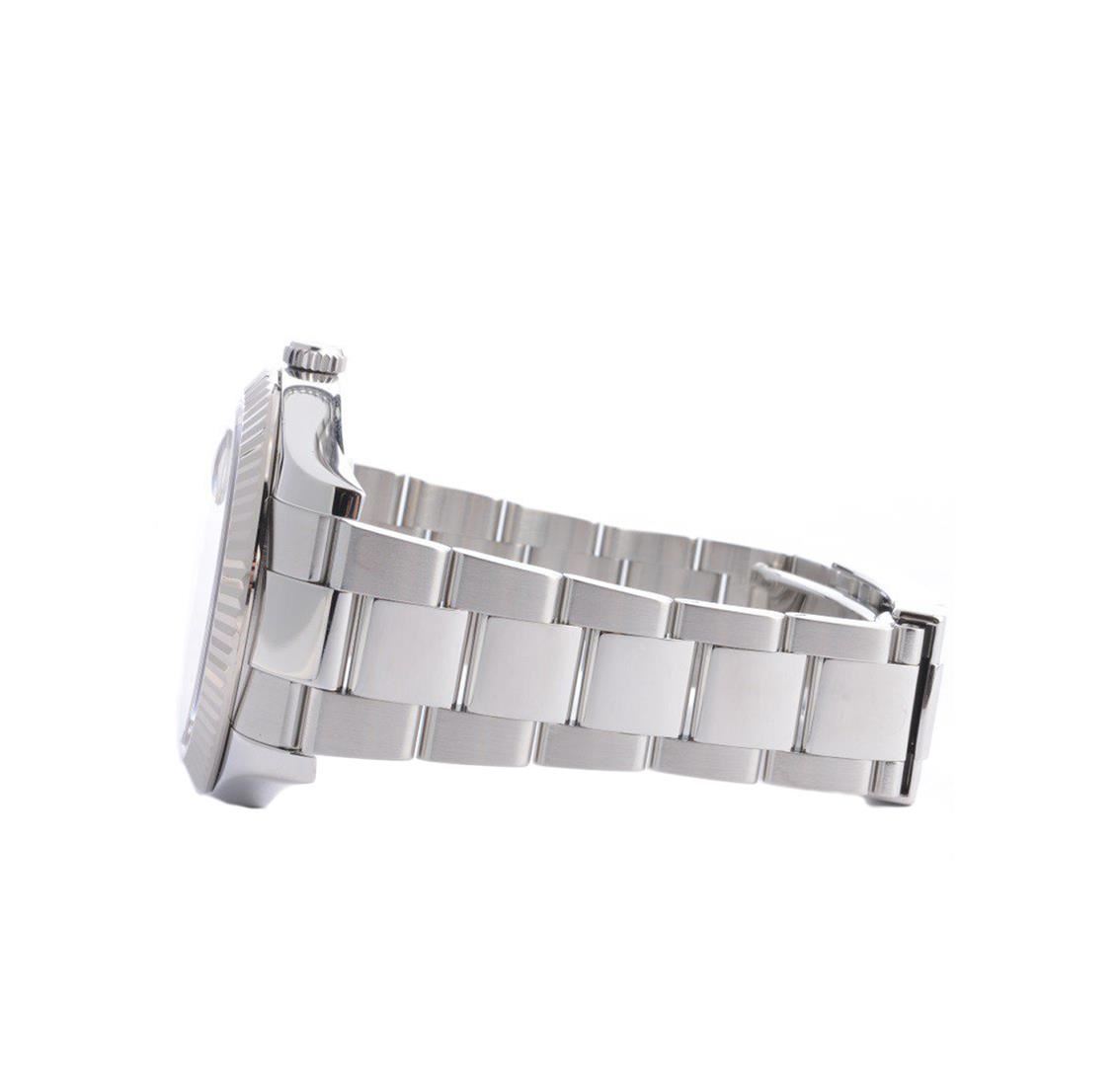 One gents stainless steel Rolex diamond DateJust II wristwatch. Model Name/Number: DateJust II 116334. The watch features automatic movement with date, scratch-resistant sapphire crystal, waterproof screw-down crown. Case: Stainless steel with 18k white gold fluted bezel (41mm), inner reflector ring engraved with serial number. Dial: Rolex Silver Diamond. Bracelet: Stainless Steel Oyster.
