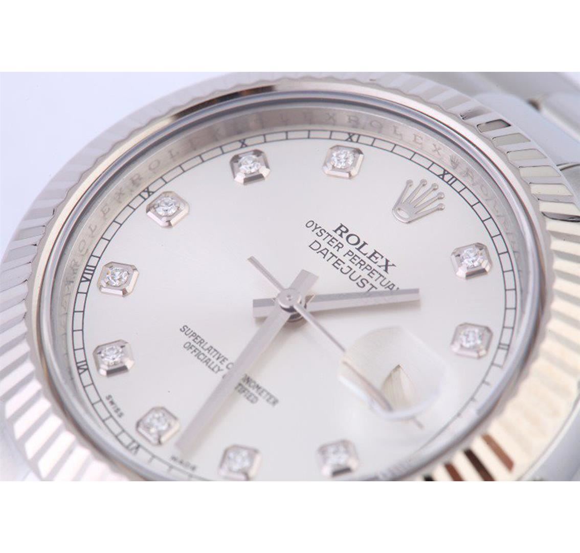 One gents stainless steel Rolex diamond DateJust II wristwatch. Model Name/Number: DateJust II 116334. The watch features automatic movement with date, scratch-resistant sapphire crystal, waterproof screw-down crown. Case: Stainless steel with 18k white gold fluted bezel (41mm), inner reflector ring engraved with serial number. Dial: Rolex Silver Diamond. Bracelet: Stainless Steel Oyster.