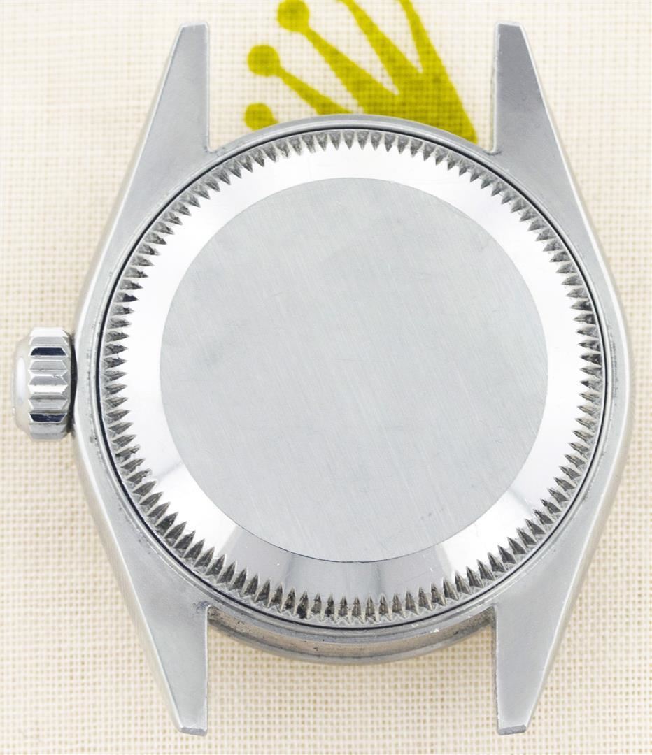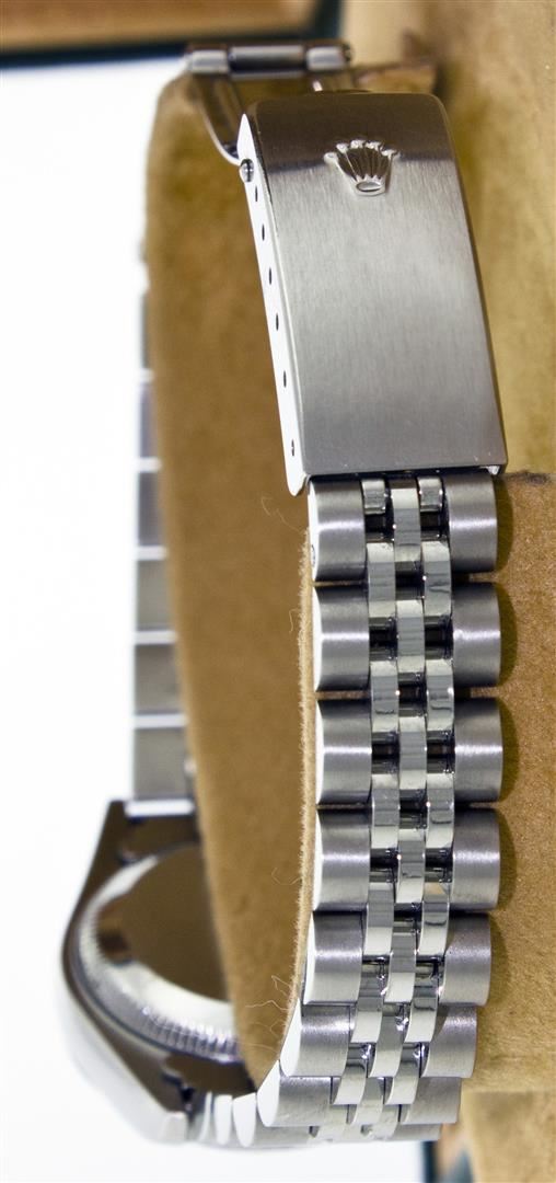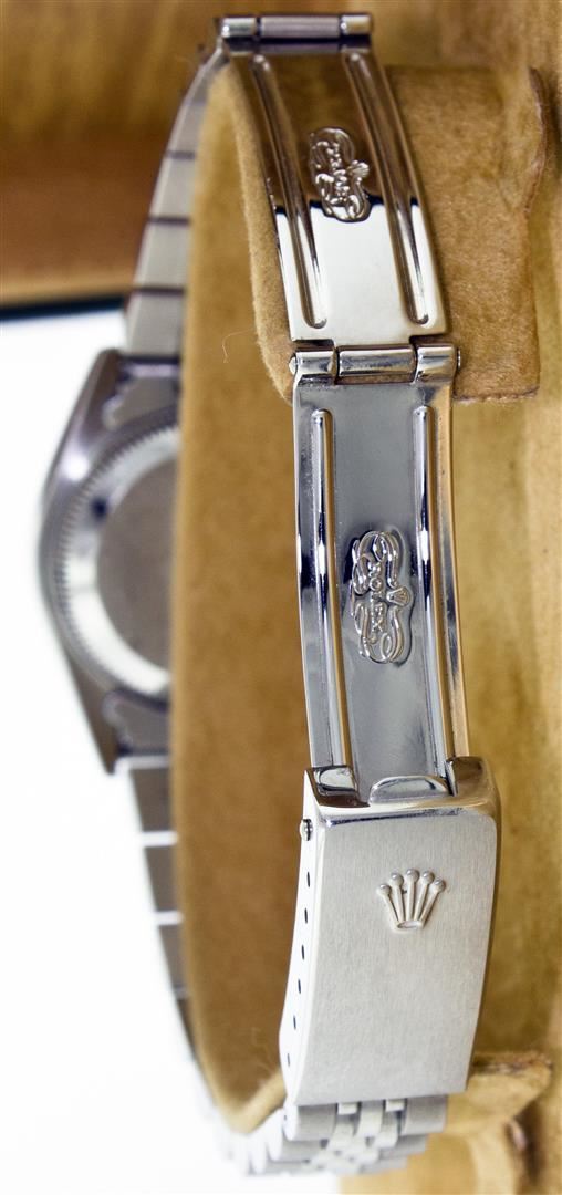 One Ladies Rolex Datejust Polished Bright with Satin Finish, Serviced & Electronically Tested, Stainless Steel Case:26mm, Stainless Steel Crown, Custom Bezel: 14K White Gold Fluted. Custom Crystal: Acrylic Cyclops Lens. Movement: Automatic Winding Movement Caliber 2030. Custom Dial: Pink Mother Of Pearl With Diamond Hour Markers, Diamond Count: 10 Diamonds, Clarity: SI-VS, Color: G to H. Date Window: 3 O'Clock Position Date Display, Non Quickset, Model: 6917 Condition: G-6 Extra Fine. Bracelet: Stainless Steel Jubilee Band. Bright Polish & Satin Finish. 5.5 Inch Length, Adjustable. Standard Clasp, With Rolex Logo.