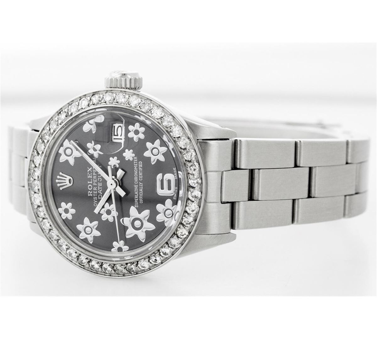 One Ladies Rolex Datejust Polished Bright with Satin Finish, Serviced & Electronically Tested, Stainless Steel Case:26mm, Stainless Steel Crown, Custom Bezel: 18K White Gold Beadset Diamond Bezel, Diamond Count: 32 Diamonds Total Weight .70 Carat, Clarity: SI-VS, Color: G to H. Custom Crystal: Synthetic Sapphire Cyclops Lens. Movement: Automatic Winding Movement Caliber 2030. Custom Dial: Grey Floral With Arabic Hour Markers. Date Window: 3 O'Clock Position Date Display, Non Quickset, Model: 6917 Condition: G-6 Extra Fine. Bracelet: Stainless Steel Oyster. Bright Polish & Satin Finish. 5.5 Inch Length, Adjustable. Standard Clasp, With Rolex Logo.