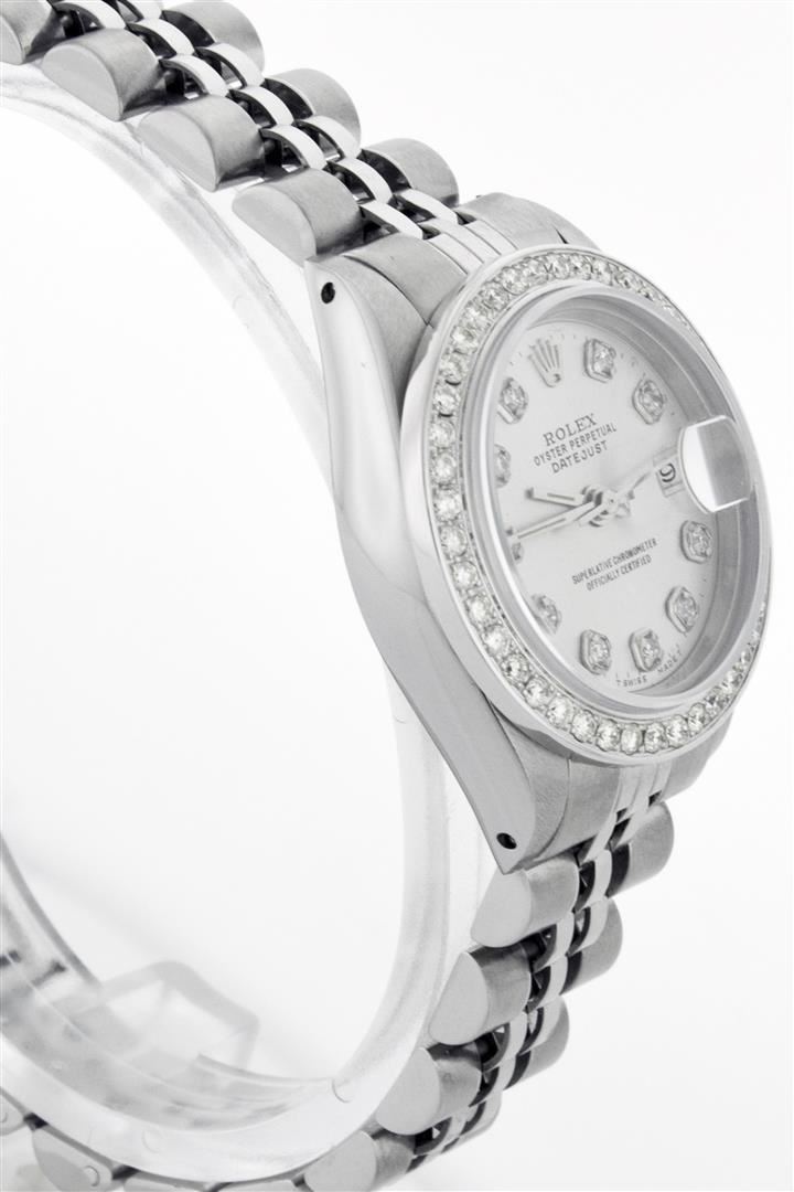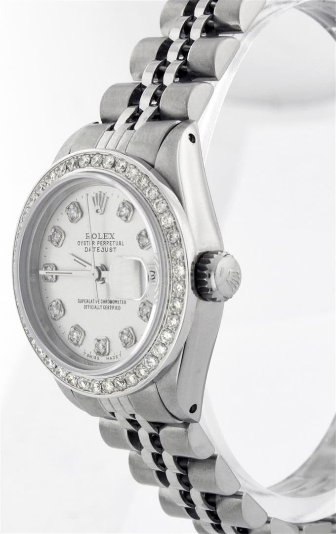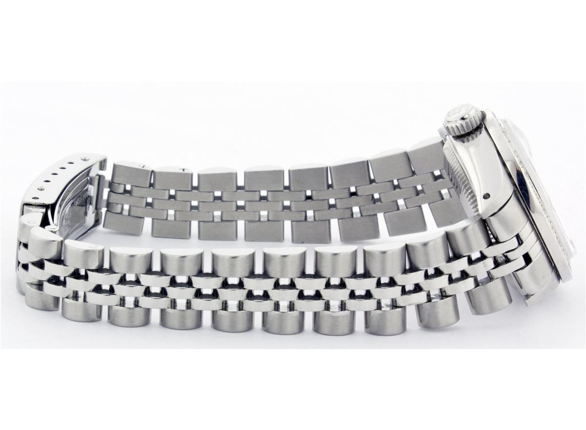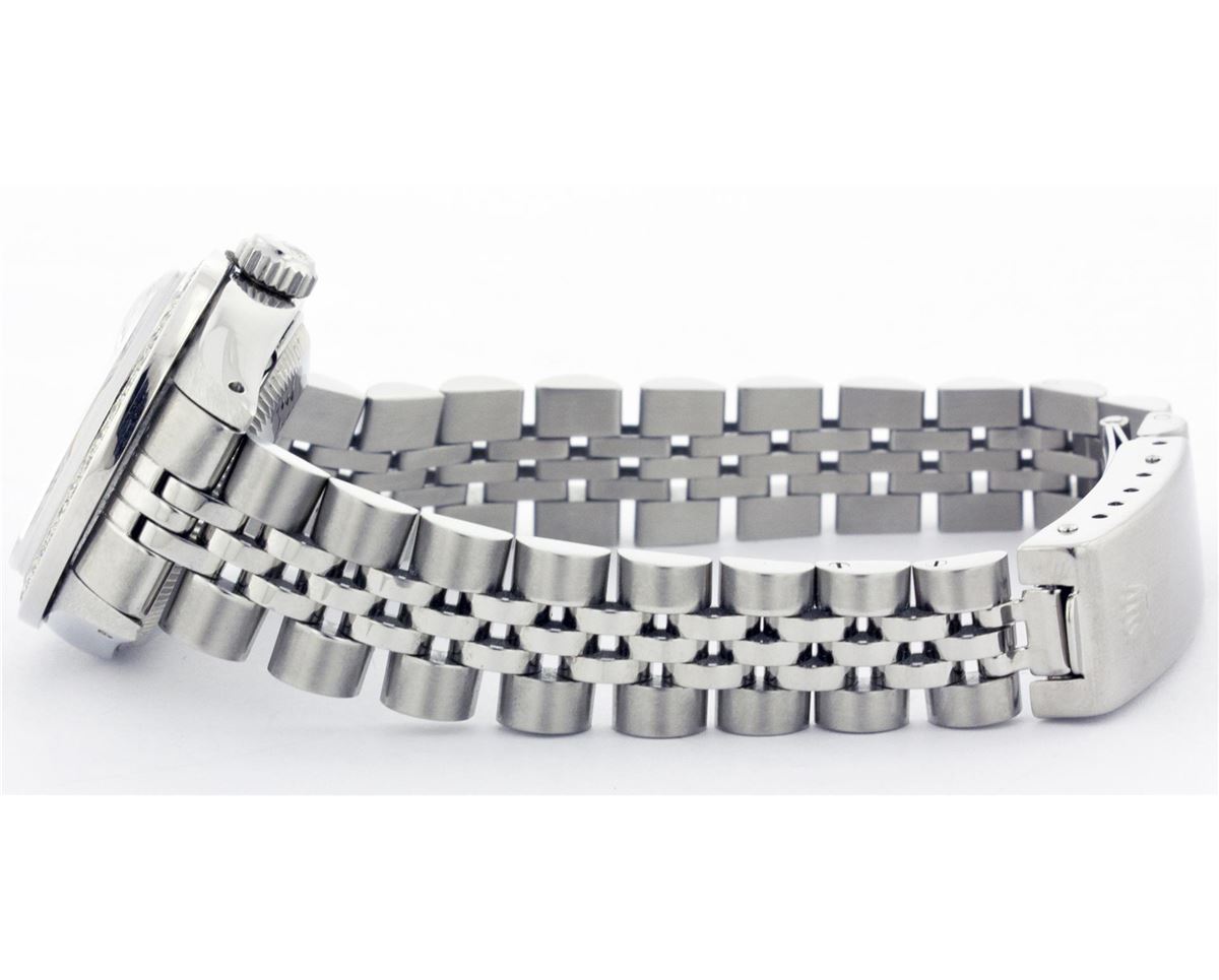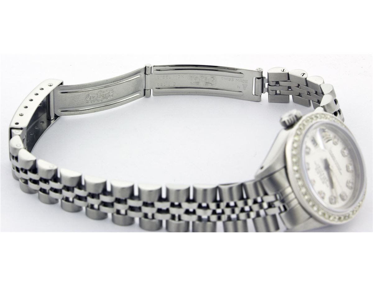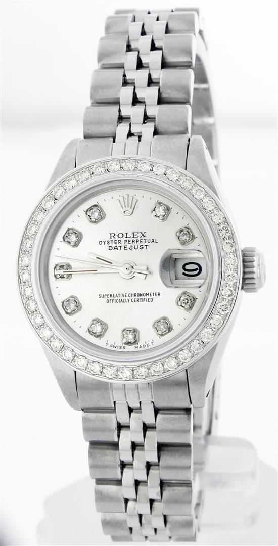 One Ladies Rolex Datejust Polished Bright with Satin Finish, Serviced & Electronically Tested, Stainless Steel Case:26mm, Stainless Steel Crown, Custom Bezel: 18K White Gold Beadset Diamond Bezel, Diamond Count: 32 Diamonds Total Weight .70 Carat, Clarity: SI-VS, Color: G to H. Custom Crystal: Synthetic Sapphire Cyclops Lens. Movement: Automatic Winding Movement Caliber 2030. Custom Dial: Silver Diamond Dial, Diamond Count: 10 Diamonds In Dial, Clarity: SI-VS, Color: G to H. Date Window: 3 O'Clock Position Date Display, Non Quickset, Model: 6917 Condition: G-6 Extra Fine. Bracelet: Stainless Steel Jubilee Band. Bright Polish & Satin Finish. 5.5 Inch Length, Adjustable. Standard Clasp, With Rolex Logo.