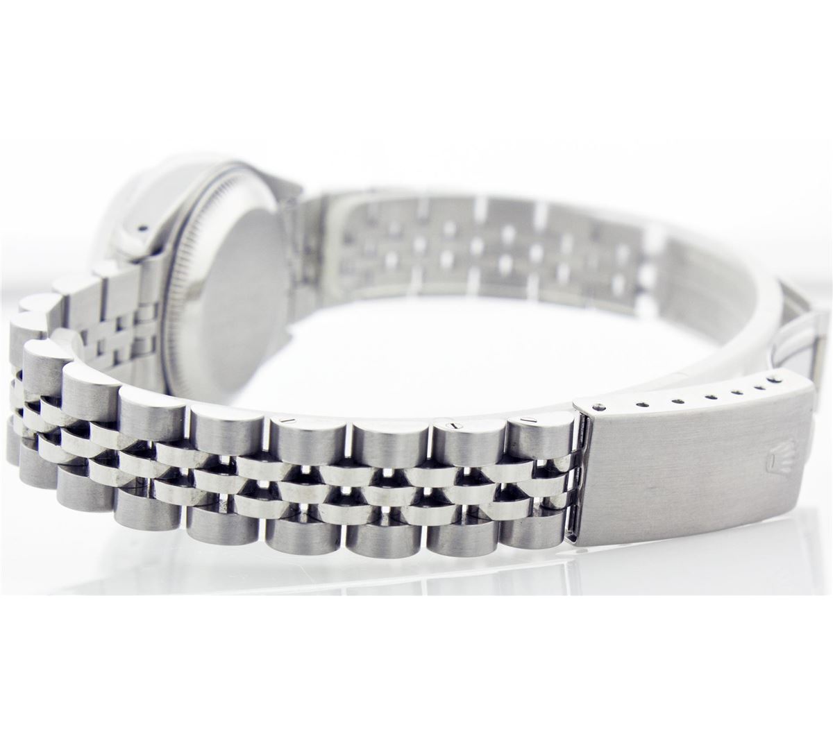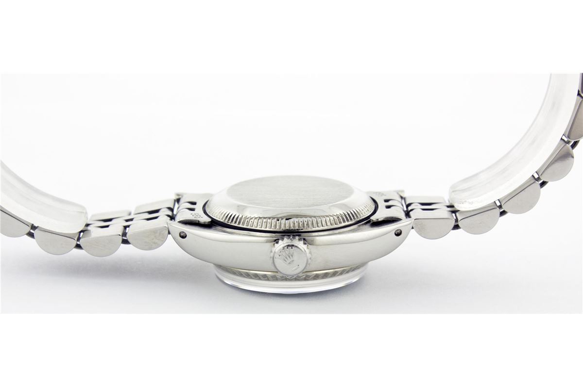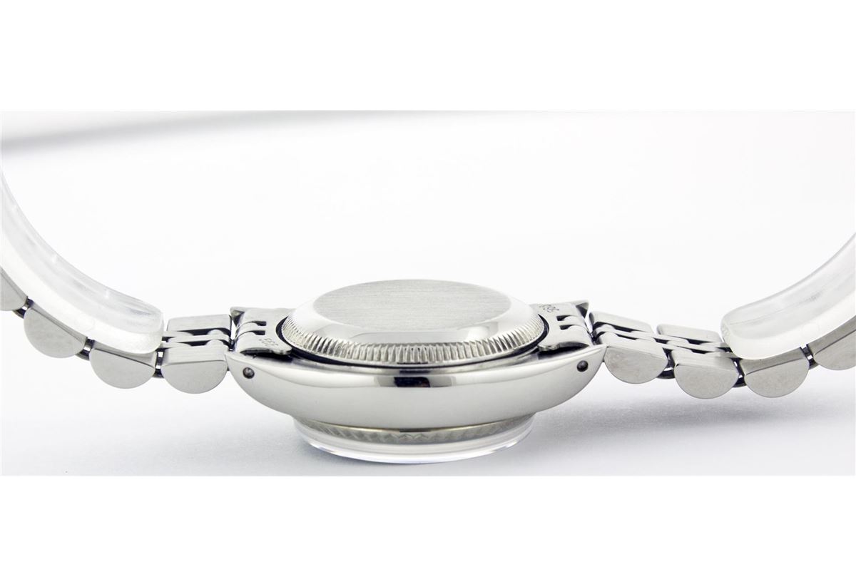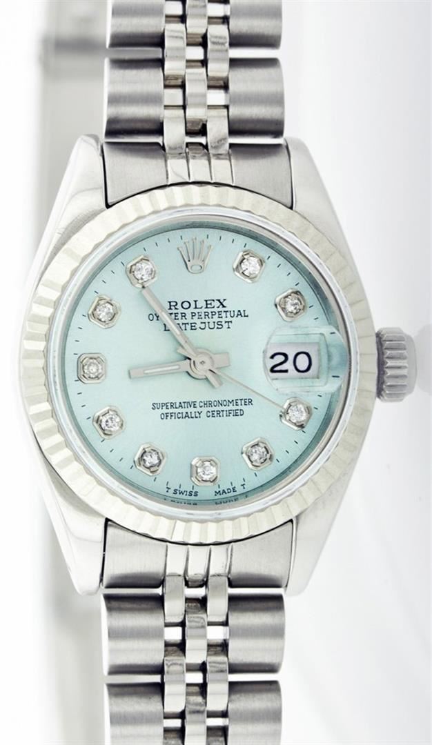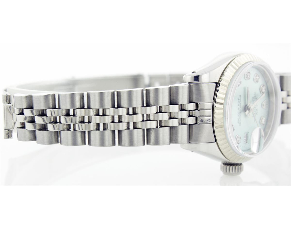 One Ladies Rolex Datejust Polished Bright with Satin Finish, Serviced & Electronically Tested, Stainless Steel Case:26mm, Stainless Steel Crown, Custom Bezel: 14K White Gold Fluted. Custom Crystal: Acrylic Cyclops Lens. Movement: Automatic Winding Movement Caliber 2030. Custom Dial: Ice Blue With Diamond Hour Markers, Diamond Count: 10 Diamonds, Clarity: SI-VS, Color: G to H. Date Window: 3 O'Clock Position Date Display, Non Quickset, Model: 6917 Condition: G-6 Extra Fine. Bracelet: Stainless Steel Jubilee Band. Bright Polish & Satin Finish. 5.5 Inch Length, Adjustable. Standard Clasp, With Rolex Logo.