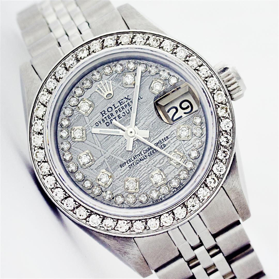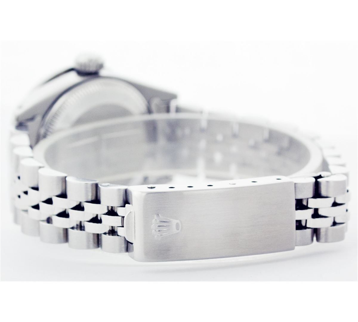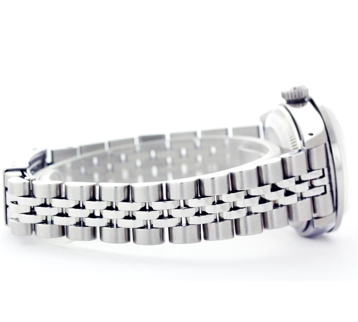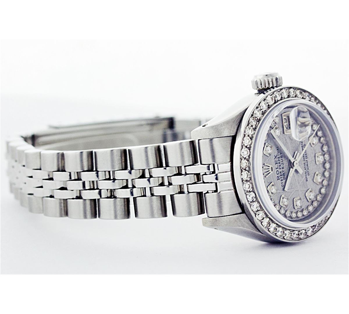 One Ladies Rolex Datejust Polished Bright with Satin Finish, Serviced & Electronically Tested, Stainless Steel Case:26mm, Stainless Steel Crown, Custom Bezel: Stainless Steel Beadset Diamond Bezel, Diamond Count: 40 Diamonds Total Weight .70 Carat, Clarity: SI-VS, Color: G to H. Custom Crystal: Synthetic Sapphire Cyclops Lens. Movement: Automatic Winding Movement Caliber 2030. Custom Dial: Meteorite String Diamond Dial. Diamond Count On Dial: 43 Diamonds, Clarity: SI-VS, Color: G to H. Date Window: 3 O'Clock Position Date Display, Model: 6917 Condition: G-6 Extra Fine. Bracelet: Stainless Steel Jubilee Band. Non quickset. Bright Polish & Satin Finish. 5.5 Inch Length, Adjustable. Standard Clasp, With Rolex Logo.