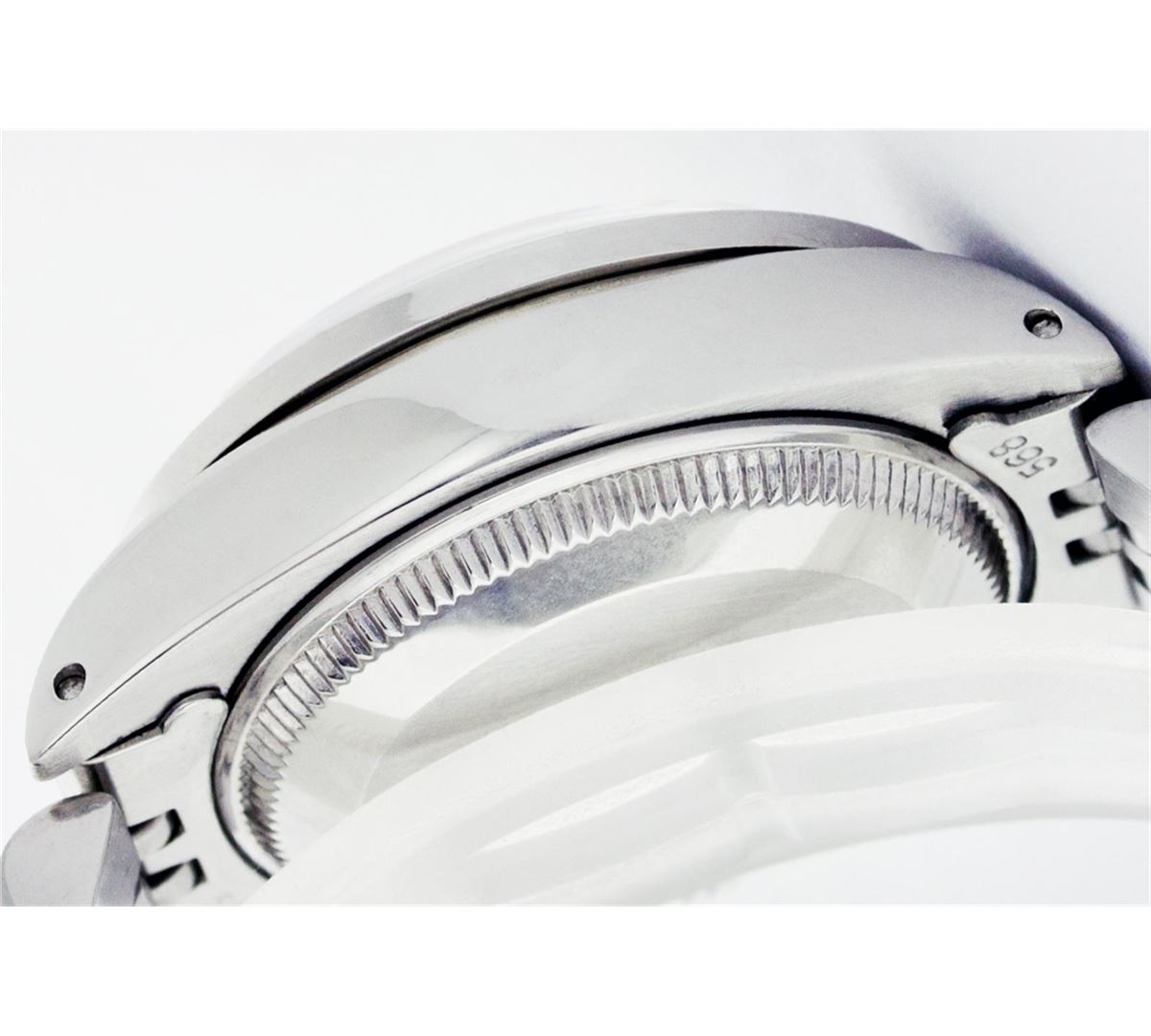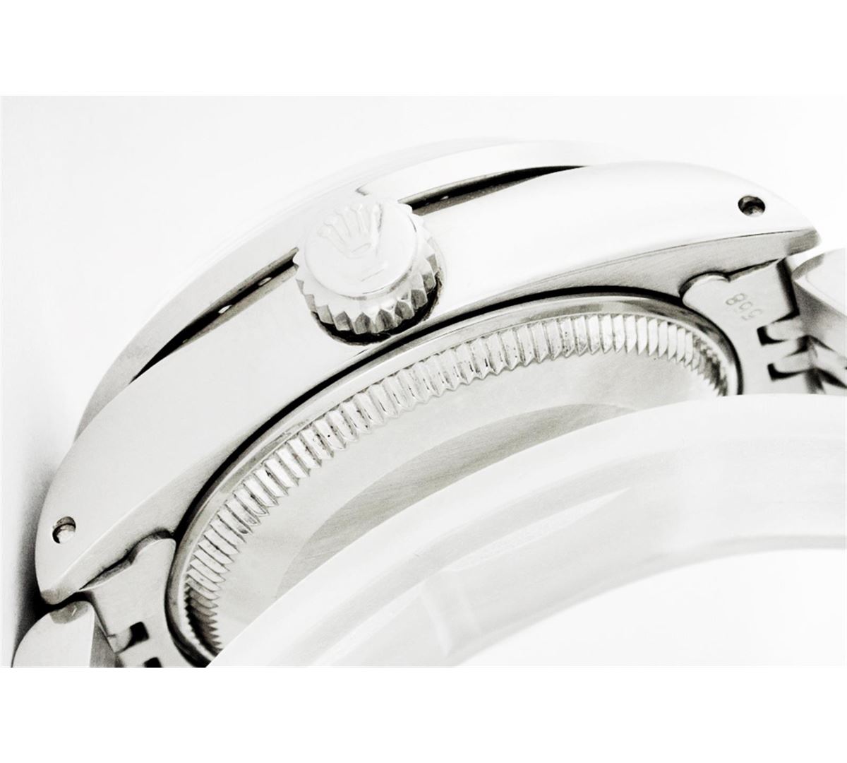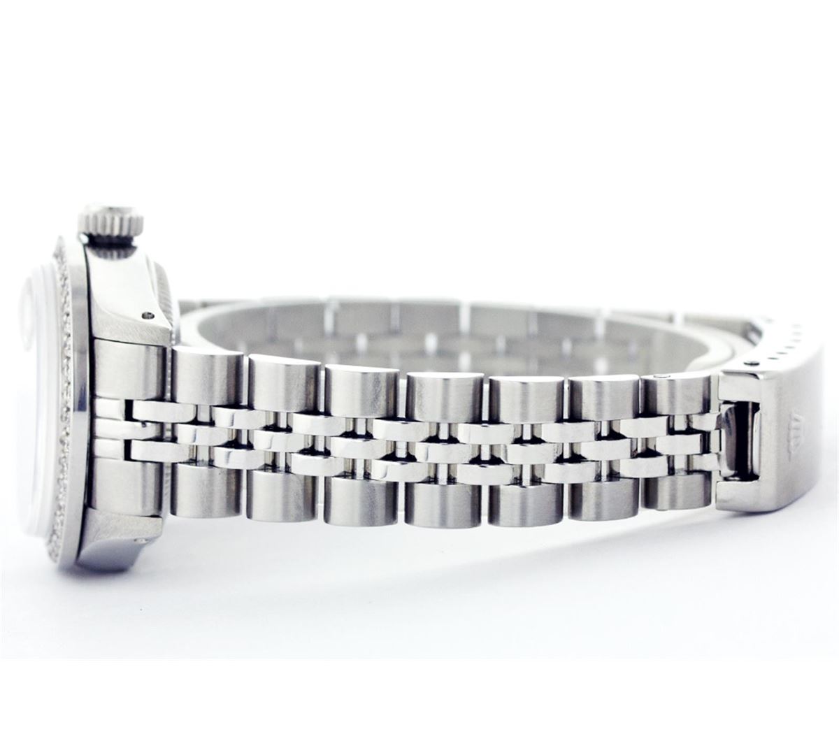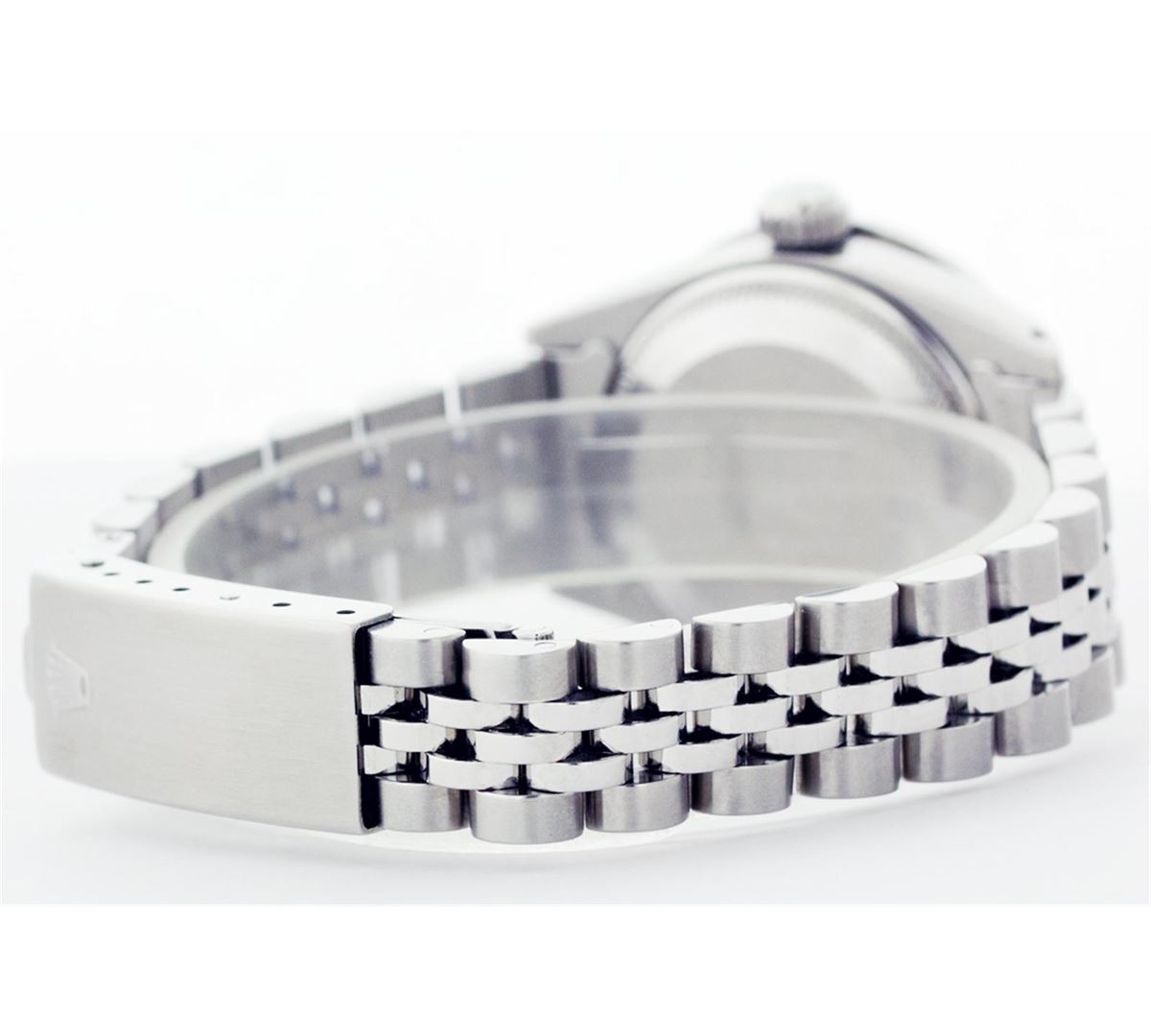 One Ladies Rolex Datejust Polished Bright with Satin Finish, Serviced & Electronically Tested, Stainless Steel Case:26mm, Stainless Steel Crown, Custom Bezel: Stainless Steel Beadset Diamond Bezel, Diamond Count: 40 Diamonds Total Weight .70 Carat, Clarity: SI-VS, Color: G to H. Custom Crystal: Synthetic Sapphire Cyclops Lens. Movement: Automatic Winding Movement Caliber 2030. Custom Dial: Meteorite String Diamond Dial. Diamond Count On Dial: 43 Diamonds, Clarity: SI-VS, Color: G to H. Date Window: 3 O'Clock Position Date Display, Model: 6917 Condition: G-6 Extra Fine. Bracelet: Stainless Steel Jubilee Band. Non quickset. Bright Polish & Satin Finish. 5.5 Inch Length, Adjustable. Standard Clasp, With Rolex Logo.
