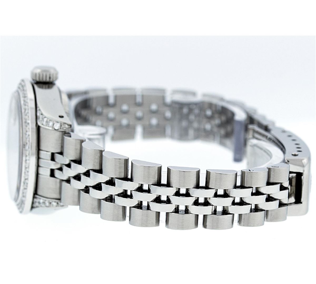 One Ladies Rolex Datejust Polished Bright with Satin Finish, Serviced & Electronically Tested, Stainless Steel Case:26mm, Stainless Steel Crown, Diamond Lugs: 16 Diamonds On Lugs, Clarity: SI-VS, Color: G to H. Custom Bezel: 18K White Gold Beadset Bezel, Diamond Count: 32 Diamonds, Total Weight 1.00 Carat, Clarity: SI-VS, Color: G to H. Custom Crystal: Synthetic Sapphire Cyclops Lens. Movement: Automatic Winding Movement Caliber 2030. Custom Dial: Refinished Orange String With Diamond Dial, 43 Diamonds in Dial G To H In Color, Clarity: VVS. Date Window: 3 O'Clock Position Date Display, Model: Datejust Condition: G-6 Extra Fine. Bracelet: Stainless Steel Jubilee. Bright Polish & Satin Finish. 6.0 Inch Length, Adjustable. Standard Clasp, With Rolex Logo. Comes with 6 month warranty.