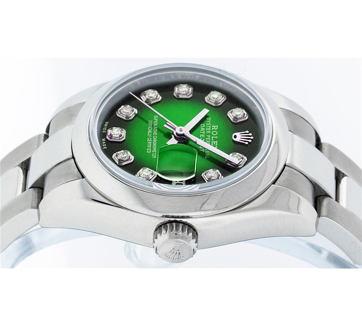 One Ladies Rolex Datejust Polished Bright with Satin Finish, Serviced & Electronically Tested, Stainless Steel Case:26mm, Stainless Steel Crown, Bezel: Stainless Steel Bezel. Custom Crystal: Synthetic Sapphire Cyclops Lens. Movement: Automatic Winding Movement Caliber 2235. Custom Dial: Refinished Green Vignette Diamond VVS, Diamond Count: 10 Diamonds in Dial G To H In Color, Clarity: VVS. Date Window: 3 O'Clock Position Date Display, Model: No Hole Datejust 179160. Condition: G-6 Extra Fine. Bracelet: Stainless Steel Oyster. Bright Polish & Satin Finish. 6.0 Inch Length, Adjustable. Standard Clasp, With Rolex Logo. Comes with 6 month warranty.