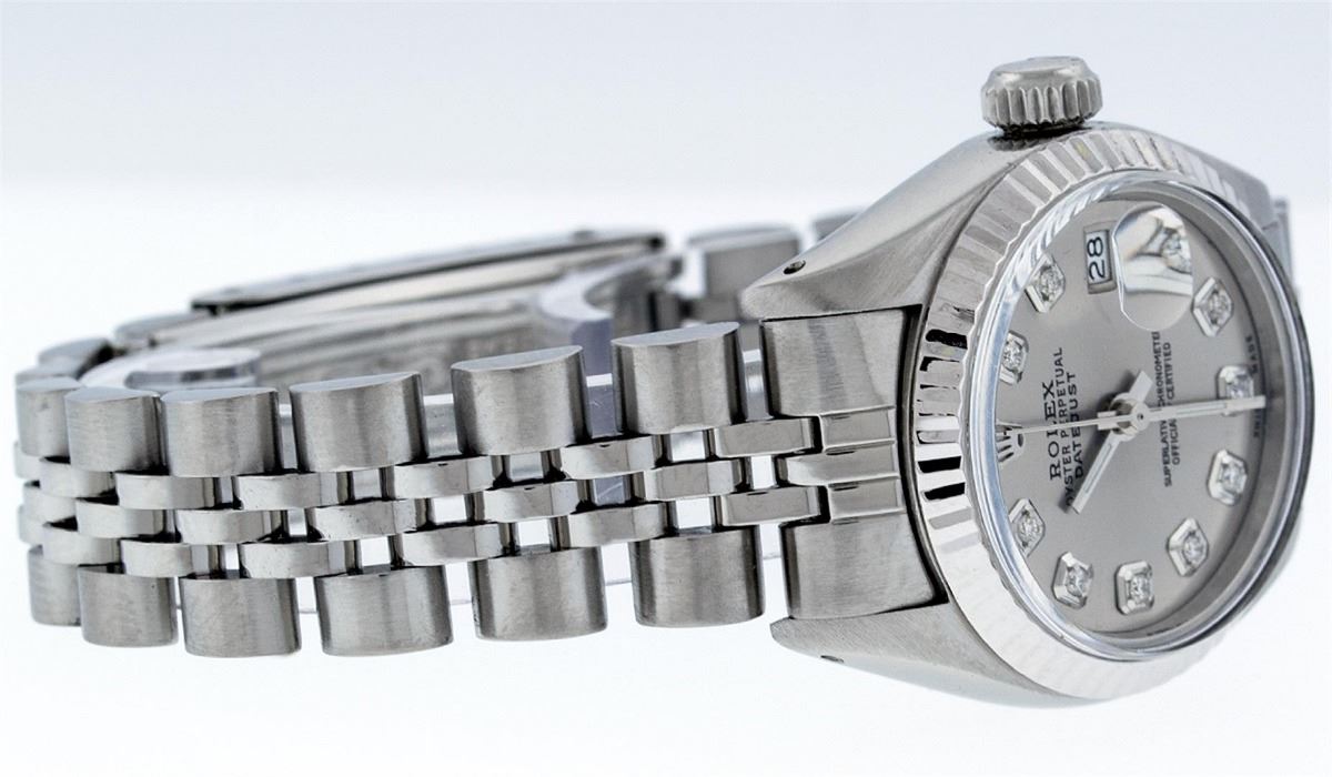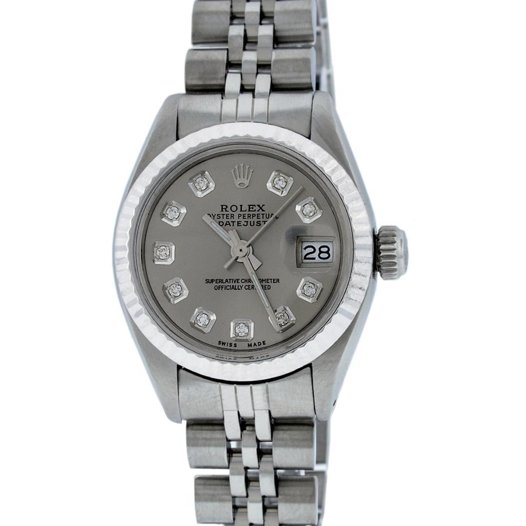 One Ladies Rolex Datejust Polished Bright with Satin Finish, Serviced & Electronically Tested, Stainless Steel Case:26mm, Stainless Steel Crown, Bezel: 14K White Gold Fluted. Custom Crystal: Acrylic Cyclops Lens. Movement: Automatic Winding Movement Caliber 2030. Custom Dial: Slate Grey With Diamond Hour Markers, Diamond Count: 10 Diamonds, Clarity: SI-VS, Color: G to H. Date Window: 3 O'Clock Position Date Display, Model: Datejust. Condition: G-6 Extra Fine. Bracelet: Stainless Steel Jubilee Band. Bright Polish & Satin Finish. 6.0 Inch Length, Adjustable. Standard Clasp, With Rolex Logo. Comes with 6 month warranty.