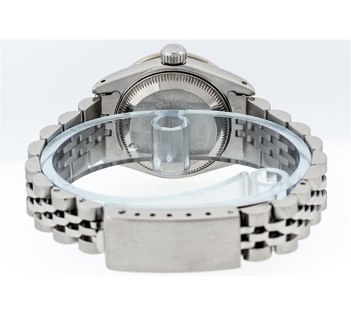 One Ladies Rolex Datejust Polished Bright with Satin Finish, Serviced & Electronically Tested, Stainless Steel Case:26mm, Stainless Steel Crown, Diamond Lugs: 16 Diamonds On Lugs, Clarity: SI-VS, Color: G to H. Custom Bezel: 18K White Gold Beadset Bezel, Diamond Count: 32 Diamonds, Total Weight 1.00 Carat, Clarity: SI-VS, Color: G to H. Custom Crystal: Synthetic Sapphire Cyclops Lens. Movement: Automatic Winding Movement Caliber 2030. Custom Dial: Refinished Slate Grey String With Diamond Dial, 43 Diamonds in Dial G To H In Color, Clarity: VVS. Date Window: 3 O'Clock Position Date Display, Model: Datejust Condition: G-6 Extra Fine. Bracelet: Stainless Steel Jubilee. Bright Polish & Satin Finish. 6.0 Inch Length, Adjustable. Standard Clasp, With Rolex Logo. Comes with 6 month warranty.
