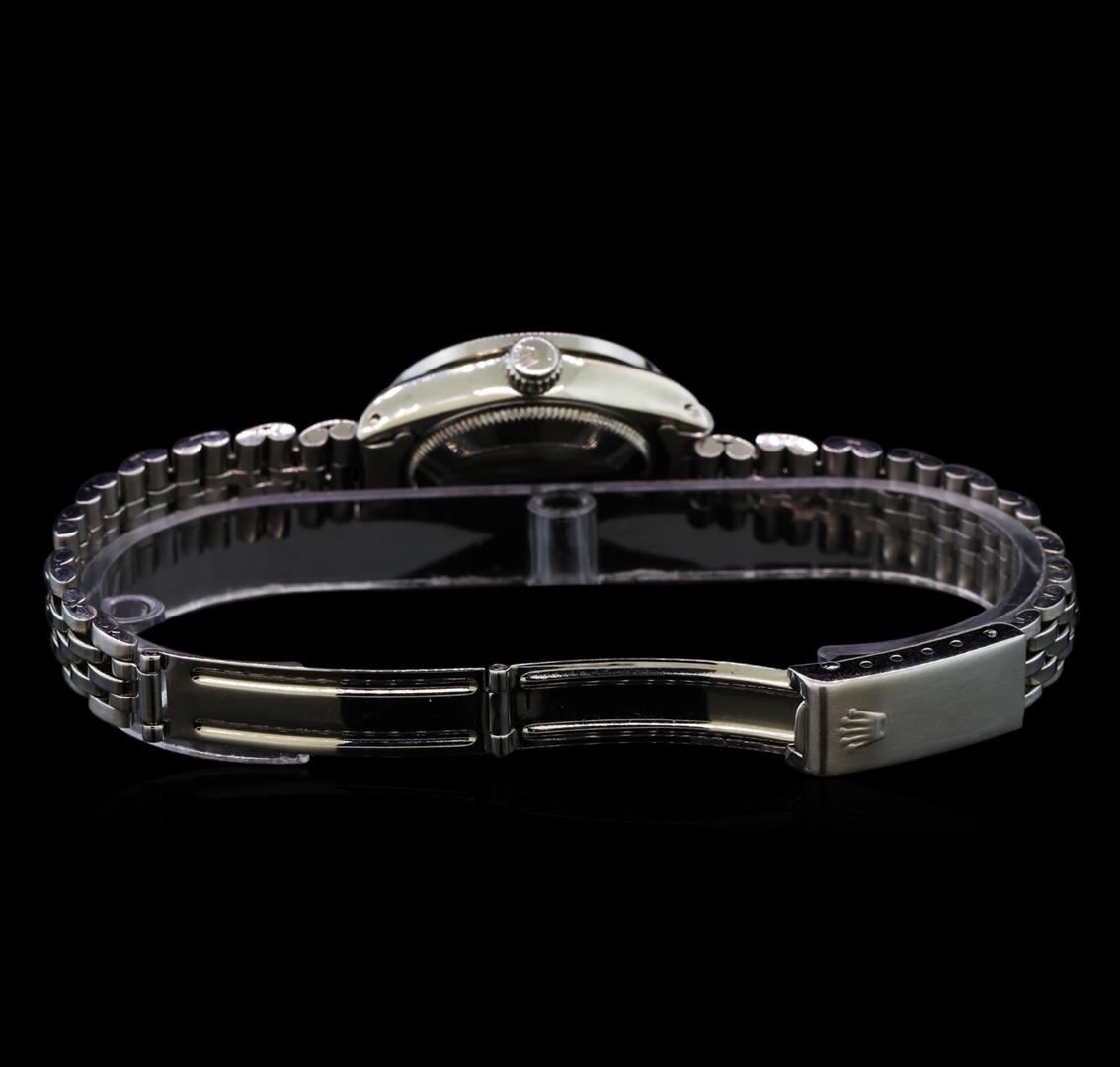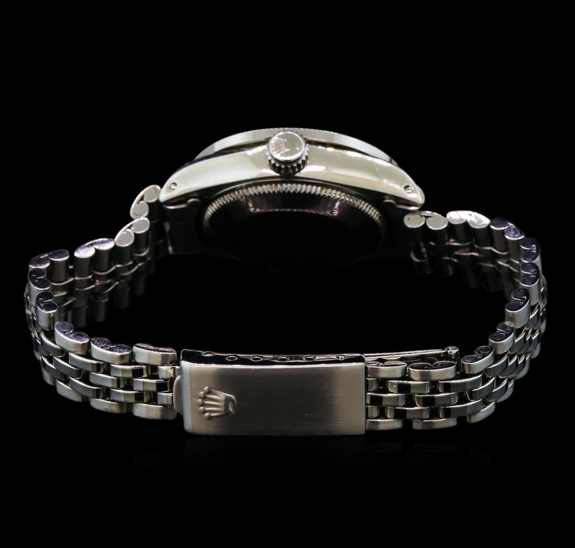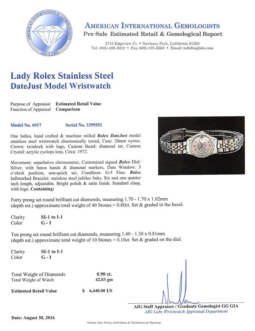 One ladies, hand crafted & machine milled Rolex DateJust model stainless steel wristwatch electronically tested, Case: 26mm oyster, Crown: twinlock with logo, Custom Bezel: diamond set, Custom Crystal: acrylic cyclops lens, Circa: 1972. Movement: superlative chronometer, Customized signed Rolex Dial: Silver, with baton hands & diamond markers, Date Window: 3 o'clock position, non-quick set, Condition: G-5 Fine. Rolex hallmarked Bracelet: stainless steel jubilee links. Six and one quarter inch length, adjustable. Bright polish & satin finish. Standard clasp, with logo. Containing: Forty prong set round brilliant cut diamonds, measuring 1.70 - 1.70 x 1.02mm (depth est.) approximate total weight of 40 Stones = 0.80ct. Set & graded in the bezel. Clarity: SI-1 to I-1 Color G - I Ten prong set round brilliant cut diamonds, measuring 1.40 - 1.30 x 0.81mm (depth est.) approximate total weight of 10 Stones = 0.10ct. Set & graded on the dial. Clarity: SI-1 to I-1 Color G - I. Total Weight of Diamonds 0.90ct. Total Weight of Watch 42.03gm. AIG Appraised at $6,440.00.