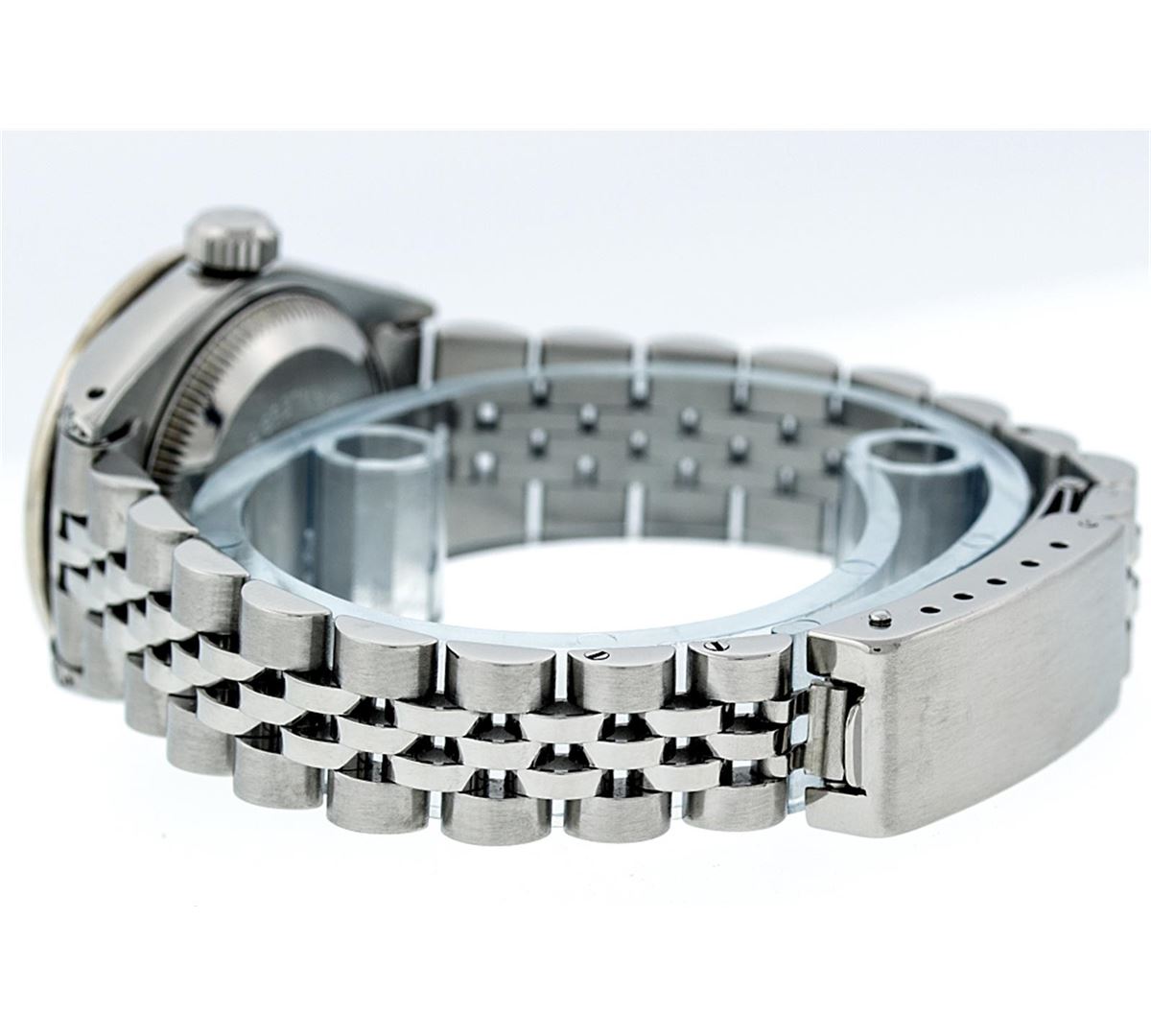 One Ladies Rolex Datejust Polished Bright with Satin Finish, Serviced & Electronically Tested, Stainless Steel Case:26mm, Stainless Steel Crown, Diamond Lugs: 16 Diamonds On Lugs, Clarity: SI-VS, Color: G to H. Custom Bezel: 18K White Gold Beadset Bezel, Diamond Count: 32 Diamonds, Total Weight 1.00 Carat, Clarity: SI-VS, Color: G to H. Custom Crystal: Synthetic Sapphire Cyclops Lens. Movement: Automatic Winding Movement Caliber 2030. Custom Dial: Refinished Salmon String With Diamond Dial, 43 Diamonds in Dial G To H In Color, Clarity: VVS. Date Window: 3 O'Clock Position Date Display, Model: Datejust Condition: G-6 Extra Fine. Bracelet: Stainless Steel Jubilee. Bright Polish & Satin Finish. 6.0 Inch Length, Adjustable. Standard Clasp, With Rolex Logo. Comes with 6 month warranty.