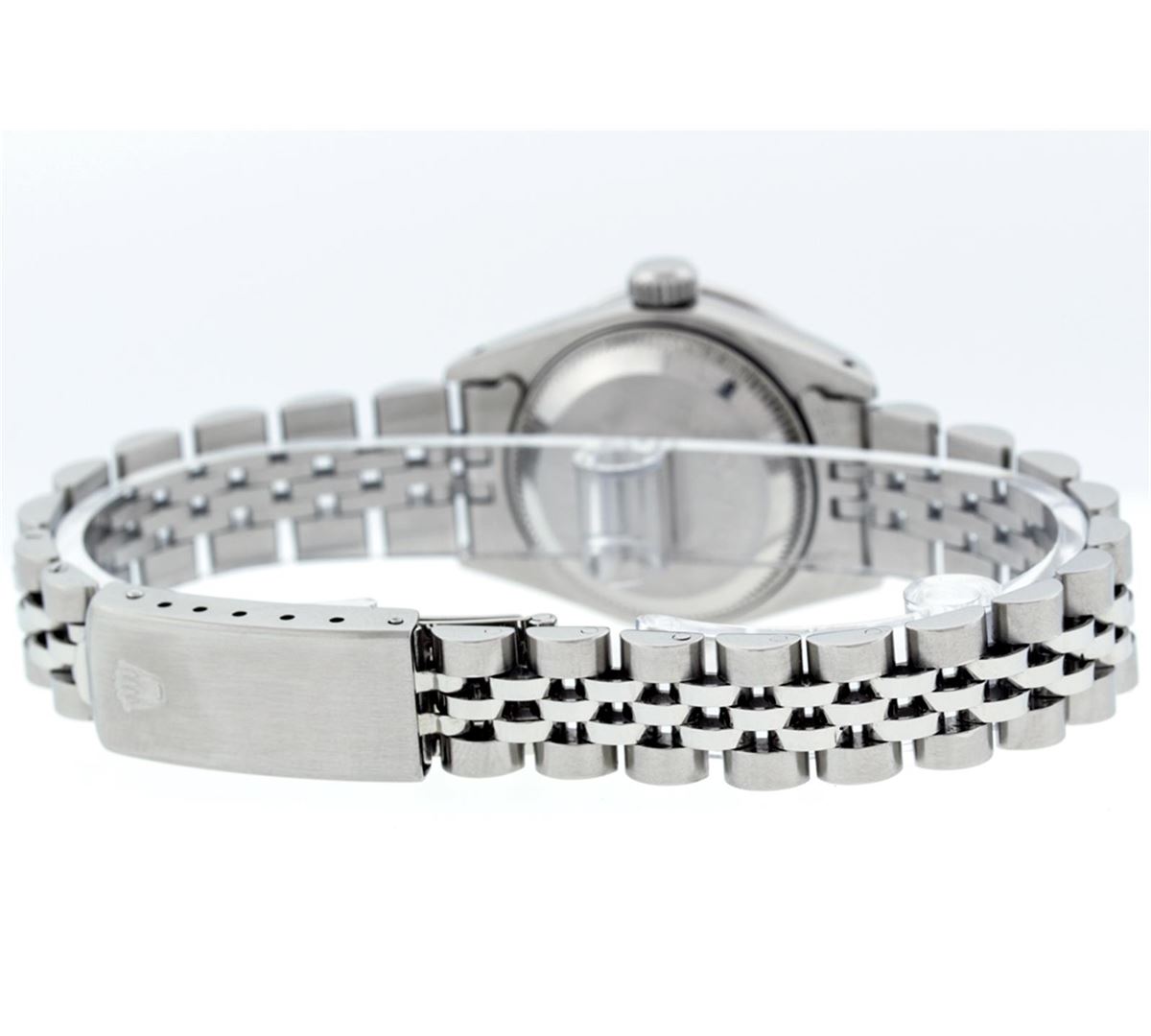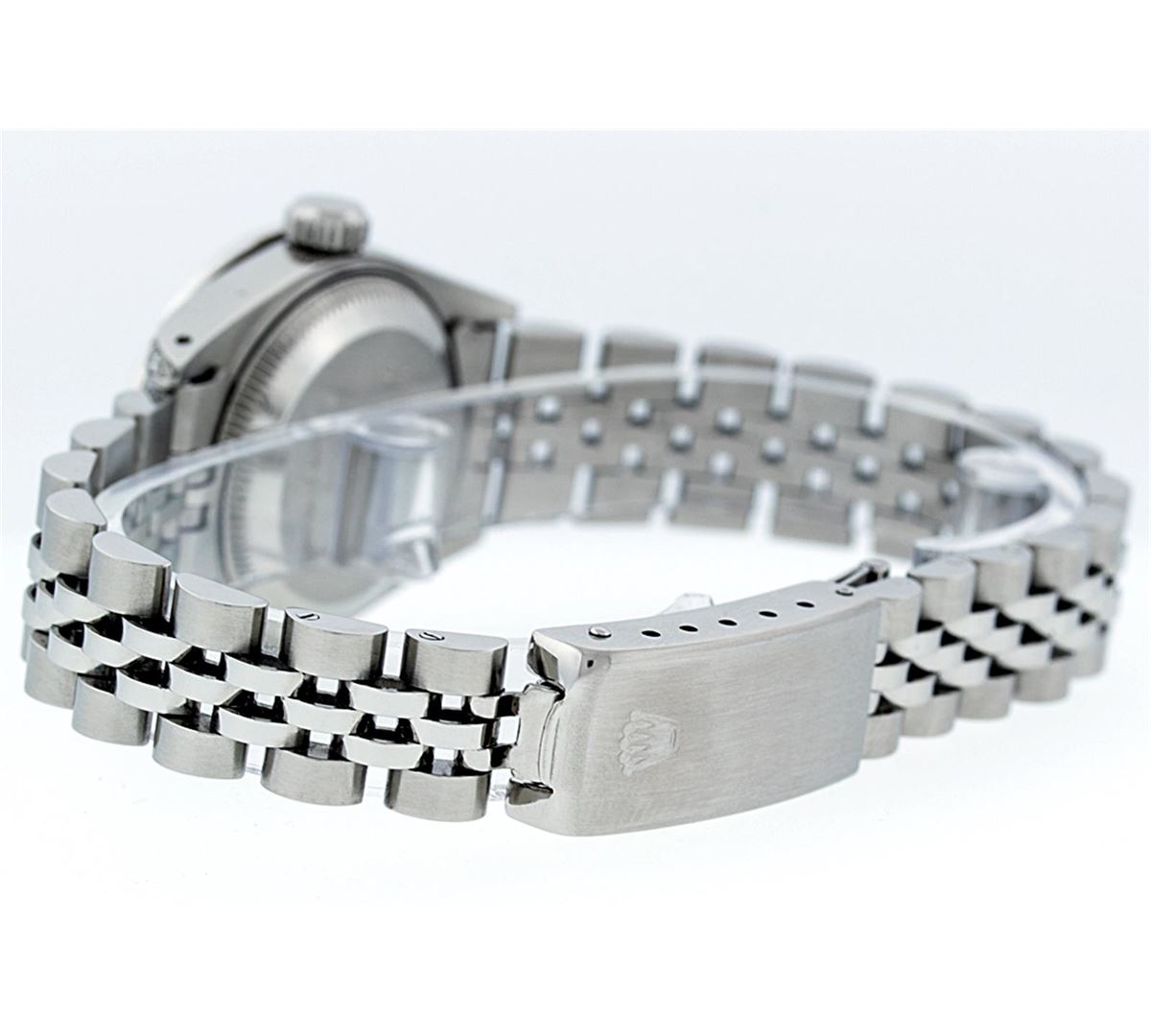One Ladies Rolex Datejust Polished Bright with Satin Finish, Serviced & Electronically Tested, Stainless Steel Case:26mm, Stainless Steel Crown, Diamond Lugs: 16 Diamonds On Lugs, Clarity: SI-VS, Color: G to H. Custom Bezel: 18K White Gold Beadset Bezel, Diamond Count: 32 Diamonds, Total Weight 1.00 Carat, Clarity: SI-VS, Color: G to H. Custom Crystal: Synthetic Sapphire Cyclops Lens. Movement: Automatic Winding Movement Caliber 2030. Custom Dial: Refinished Orange String With Diamond Dial, 43 Diamonds in Dial G To H In Color, Clarity: VVS. Date Window: 3 O'Clock Position Date Display, Model: Datejust Condition: G-6 Extra Fine. Bracelet: Stainless Steel Jubilee. Bright Polish & Satin Finish. 6.0 Inch Length, Adjustable. Standard Clasp, With Rolex Logo. Comes with 6 month warranty.